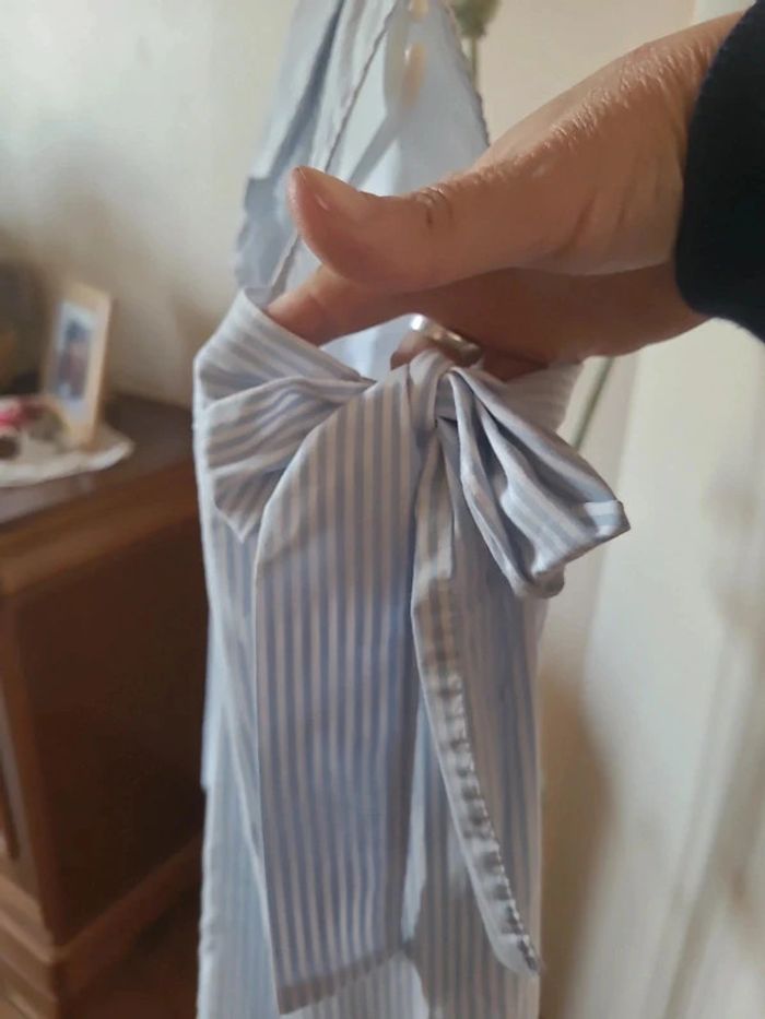⬇️mes autres annonces pour femme en taille 42 👉 #cg89femme42 😁 réductions activées des 2 articles ! une chemise manches longues avec de fines rayures bleues claires. Des manches à épaules découvertes avec des noeuds à nouer. Cela lui donne un charme fou. bon état, taille 42, marque cache cache.