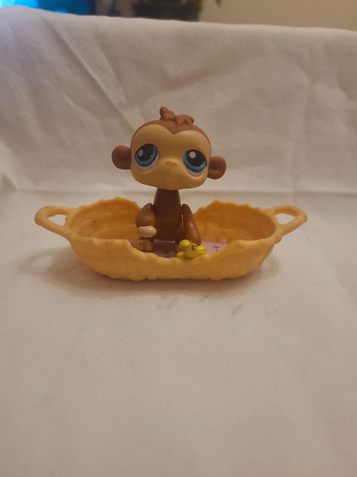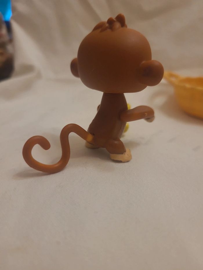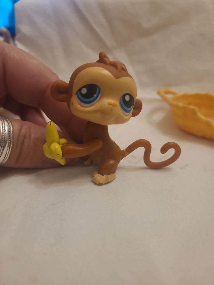 ⬇️mes autres annonces de petshop👉 #cg89petshop 😁 réductions activées des 2 articles ! un singe petshop qui a une banane dans la main, quand on tourne sa tête, le bras monte. C'est un petshop aimanté de 1ere génération. Bon état #petshop #singepetshop #lps #chimpanzepetshop