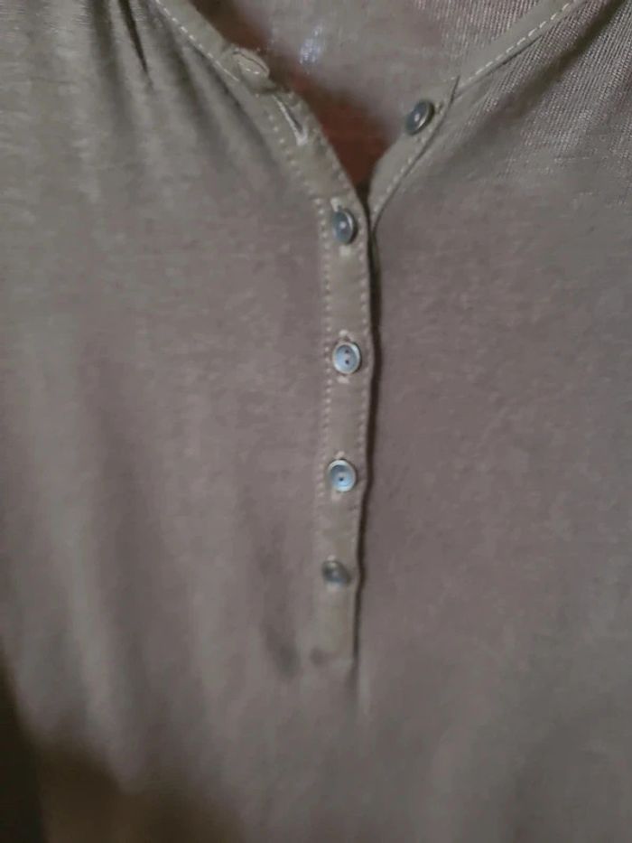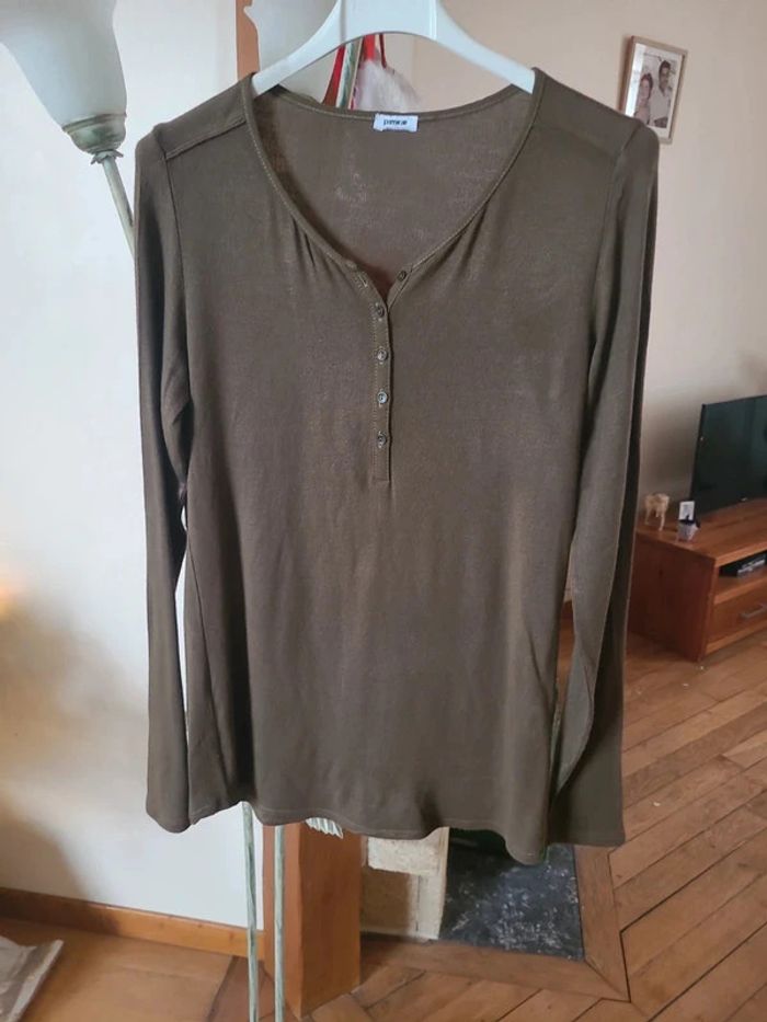 ⬇️mes autres annonces pour femme taille 38👉 #cg89femme38 😁 réductions activées des 2 articles ! un tshirt manches longues kaki, avec un beau col et des petits boutons devant. Il mesure 41 cm aux aisselles, 36 cm aux épaules et 67 cm de longueur Bon état, marque Pimkie, taille 38