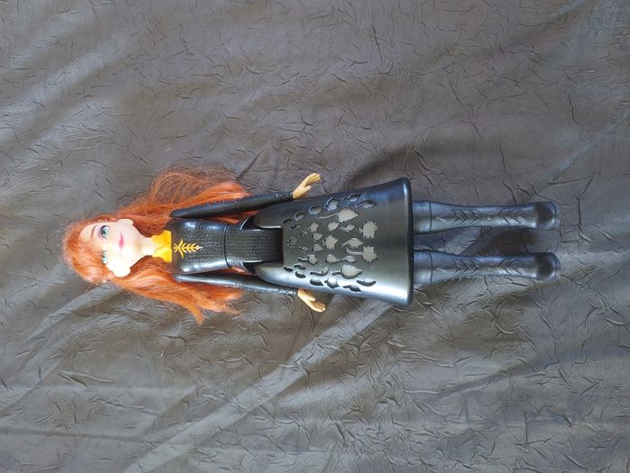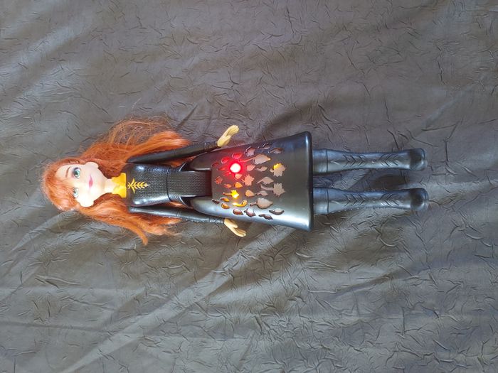 Poupée Anna de la Reine des Neiges électronique. La partie basse s'allume quand on bouge le bras. Bon état mais présence de cheveux coincés dans le bras (mais ne gêne pas le fonctionnement).