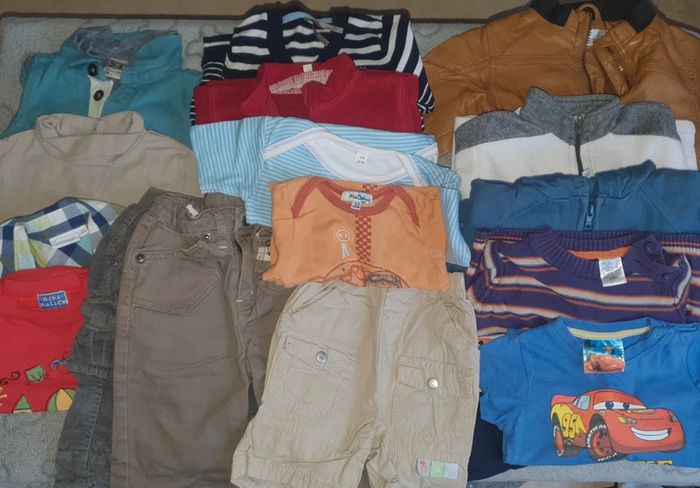 Lot 12 mois garçon Lot comprenant 1manteau mi saison, 2 bodies, 1 chemise, 2 pantalons, 3 tee shirts, 1 ensemble short et maillot, 3 pulls, 1 veste, 1 gilet et 1 pantacourt #elostitch12moisgarcon