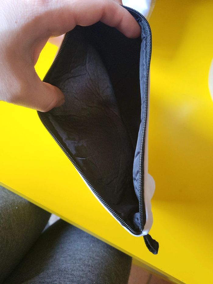 Pochette trousse maquillage ou autre Jamais utilisé Motif famille papa maman et petite fille 👧 Family Je ne sais pas si la pochette a un défaut mais voir photo je ne sais pas si c'est normal le noir au niveau du blanc sa me paraît normal 😁😁