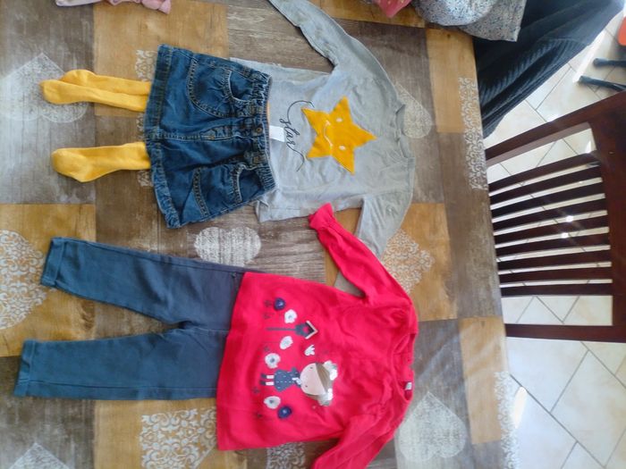 Lots vêtements filles 12 mois : 1 jupe 1 collant coton 1 combi short maillot de bain 2 pantalons 4 t-shirts manches longues 1 legging 1 pyjama pantalon t-shirt manches longues .