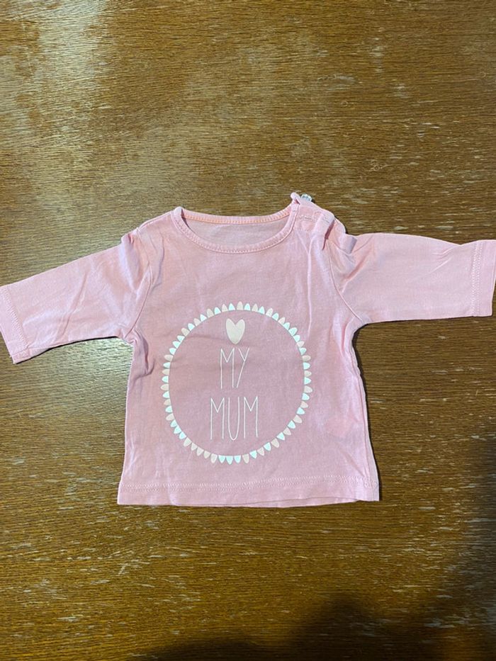 T-shirt manche longue rose "My mum" 1 mois, en très bon état