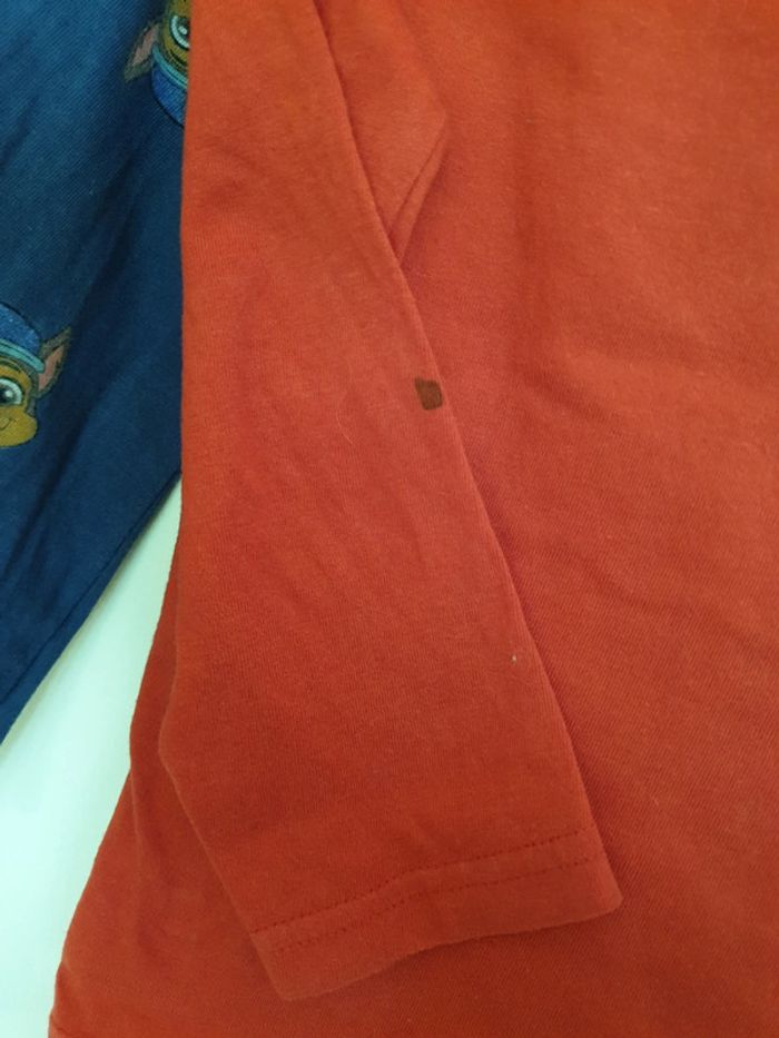Lot de 2 Tee-shirt ML 98 cm + 1 Tee-shirt Mc Le rouge ML a une petite tâche sur la manche Et le bleu a la couleur un peu passé En bon état