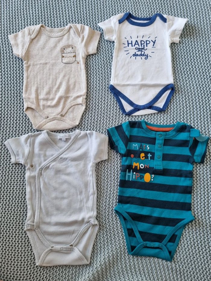 Lot de 4 bodies à manches courtes.2 cols américains, un cœur croisé et un boutonnière à l'avant. Marque Kiabi : beige avec dessin de poche tenue par un lion "mini little" Marque In Extenso : blanc à biais bleu Klein " Happy cool daddy" Marque DPAM : bleu clair Marque Du Pareil au Même : rayures " Mais où est mon Hippo ?" Taille 3 mois. #mimidacenfant #mimidacgarçon3mois