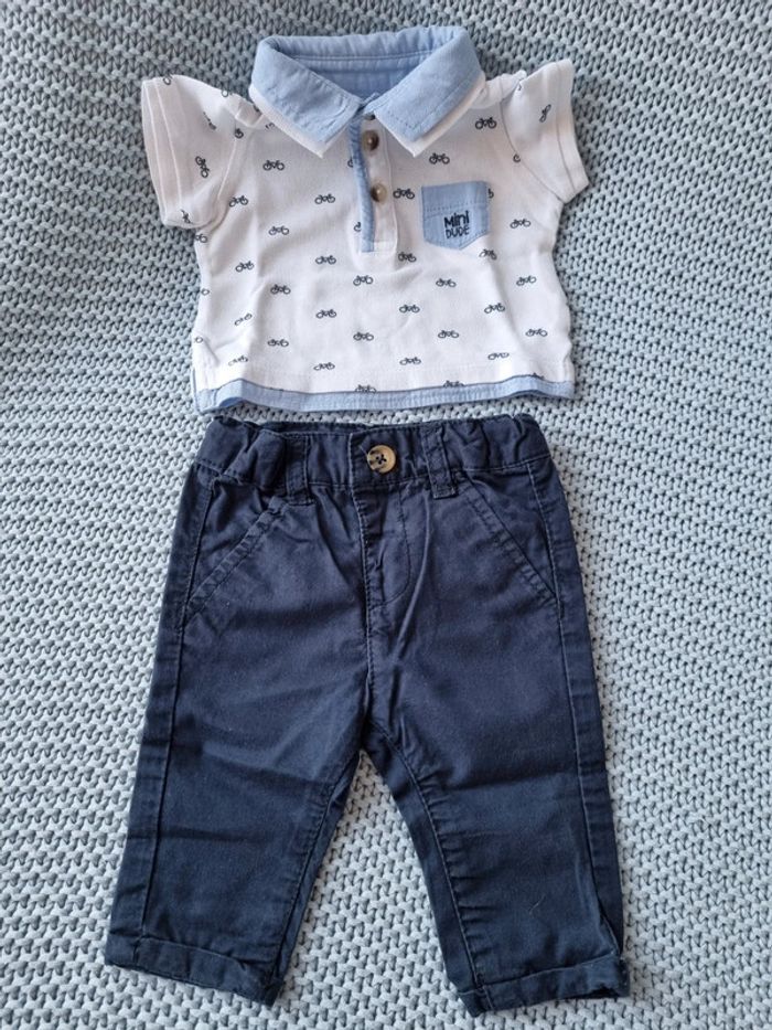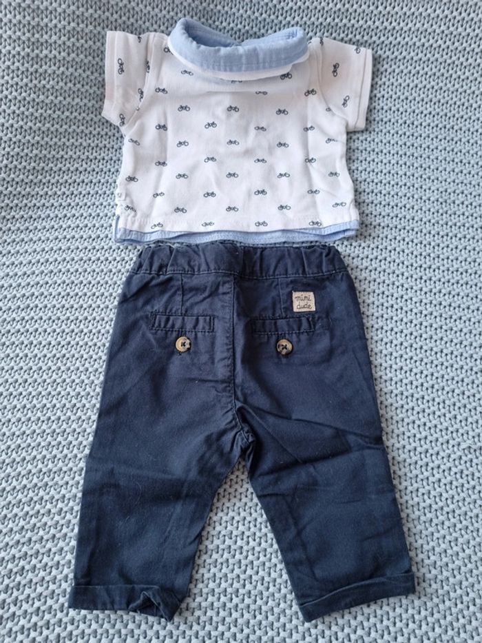 Polo à motifs vélos et pantalon léger bleu marine. Marque Kiabi. Taille 1 mois. #mimidacenfant #mimidacgarçon1mois