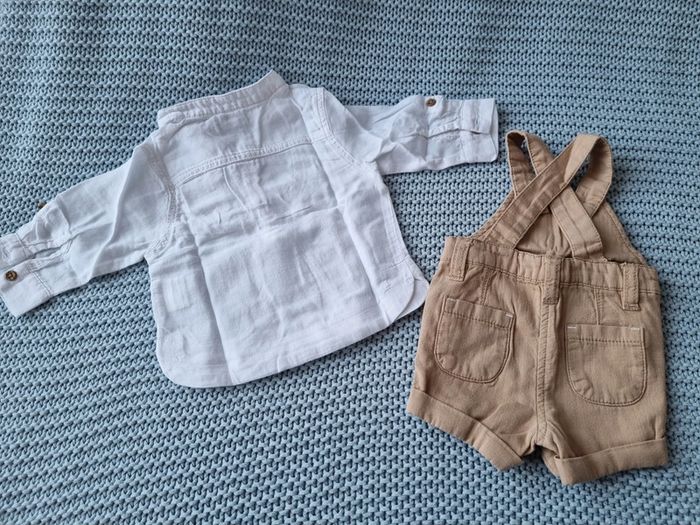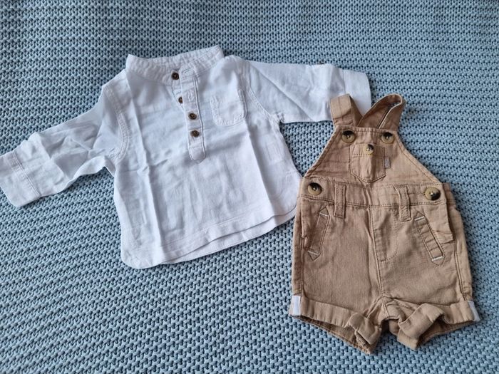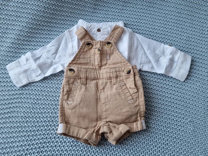 Ensemble chemise et salopette short. Chemise col Mao, manches retroussables. Salopette dos croisé. Porté 1 fois. Marque Kiabi. Taille 1 mois. #mimidacenfant #mimidacgarçon1mois