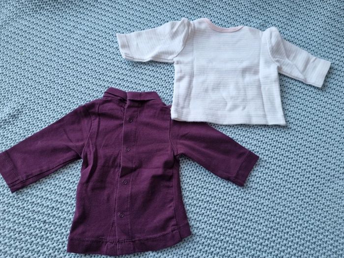 Lot de 2 t shirts manches longues Marque Kitchoun : violet à col roulé. Marque Baby club C&A : blanc à rayures roses, col américain. Taille 1 mois. #mimidacenfant #mimidacfille1mois
