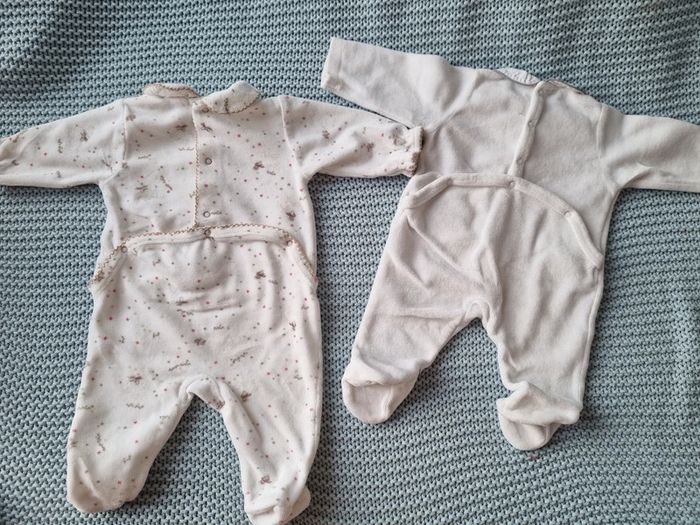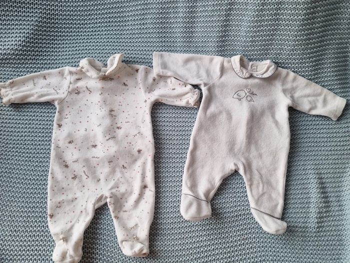Lot de 2 pyjamas blancs. Marque Bout'chou. Motif étoiles et lapins à noeud / oiseaux "love" gris. Taille 1 mois. Unisexe. #mimidacenfant #mimidacfille1mois #mimidacgarçon1mois