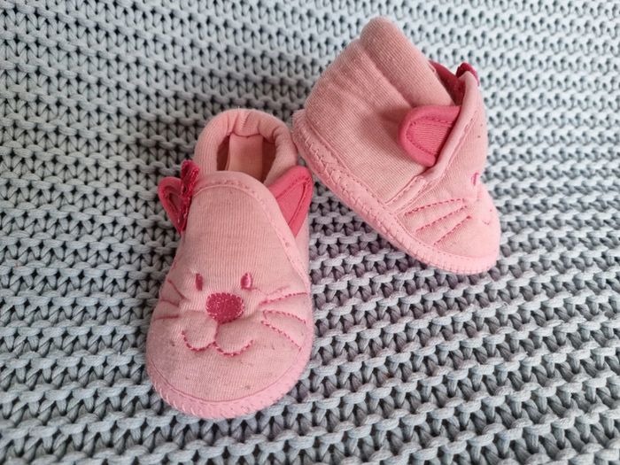 Chaussons roses tête de chat. Longueur de semelle : 9 cm L'élastique est détendu mais la forme tient au pied. #mimidacchaussures #mimidacchaussuresbébé