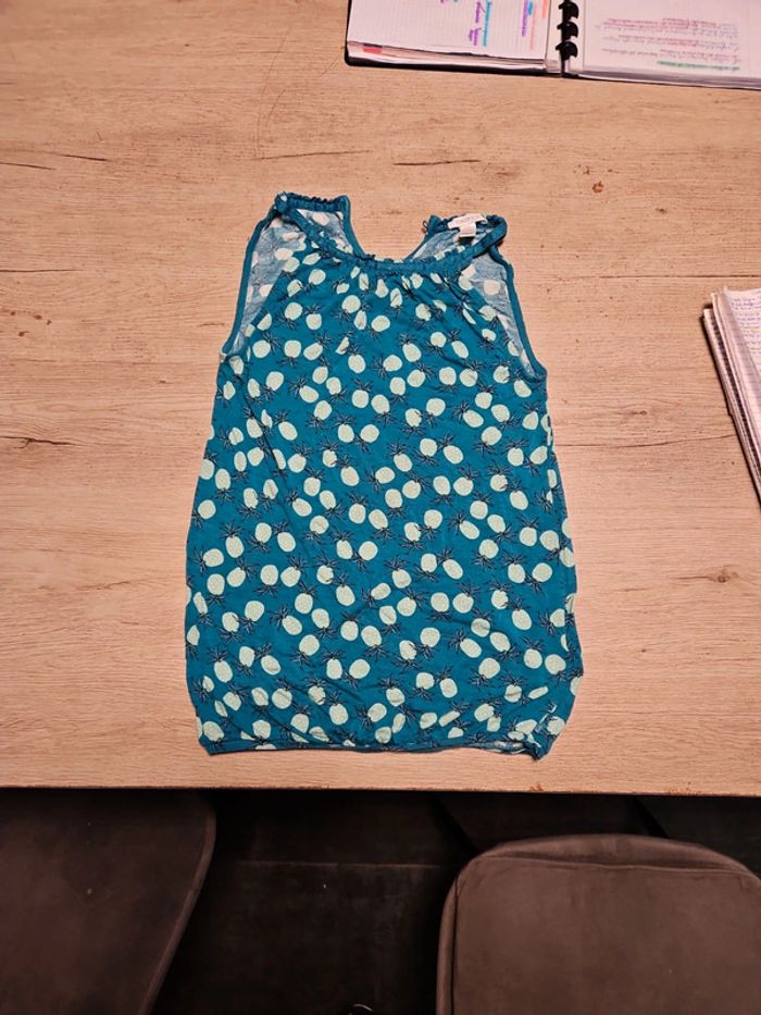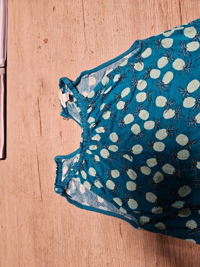 Jolie blouse élastique et agréable à porter. Rétrécie et élastique dans le bas. Nickel car ma fille ne l a mise qu une fois. Se ferme par 1 bouton dans le haut du dis. Convient bien pour un 13 ou 14 ans. Couleurs très originales ; style de turquoise foncé tirant sur le bleu #deborahtock_12ans #deborahtock_14ans