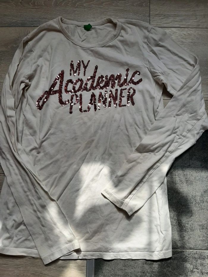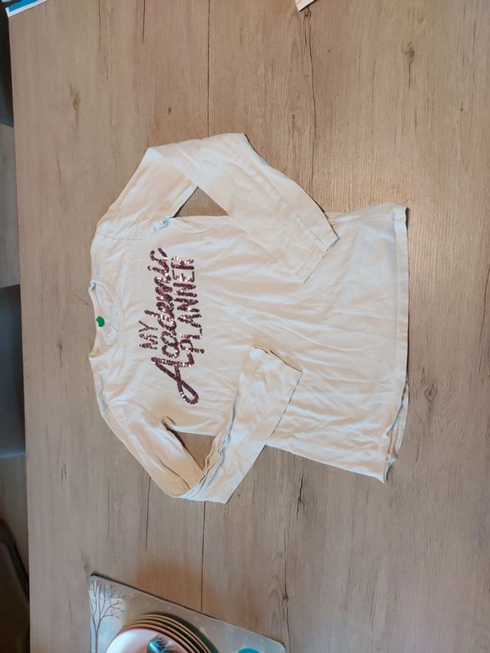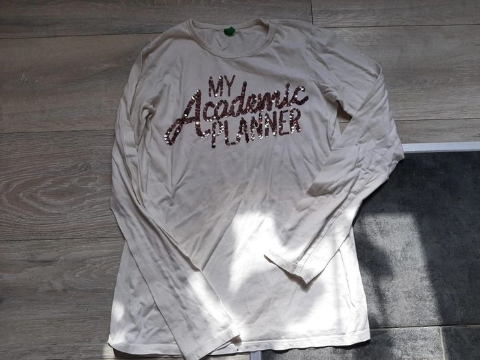 T shirt blanc, manches longues, dessin en sequin, Benetton, taille 13/14 ans - photo numéro 1
