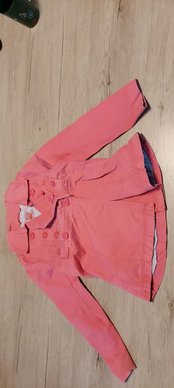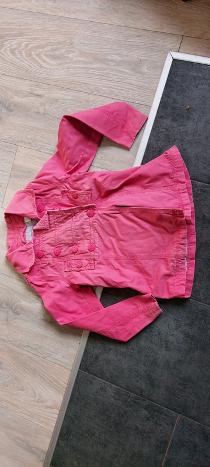 Jolie petite veste rose délavée. Elle a été mise. Ideal pour le printemps. Attention, il y a 1 écusson derrière car petite tâche qui ne partait pas. Un des boutons de l arrière est un peu usé. Elle esr doublee. Ideal pour du 5/6 ans #deborahtock_5ans
