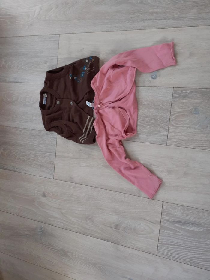 Lot de 2 gilets. Le brun est sans manche, très peu mis.se ferme par 1 pression. L autre est Obaibi, court #deborahtock_12/18mois #deborahtock_2ans