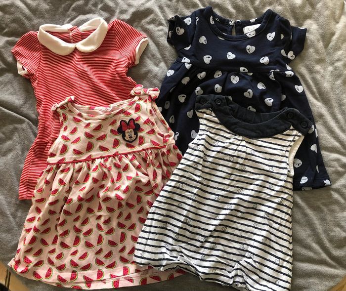Rouge col Claudine : petit bateau Bleu à cœurs : Kimbaloo Rose à pastèque : Disney Rayée bleue : kiabi