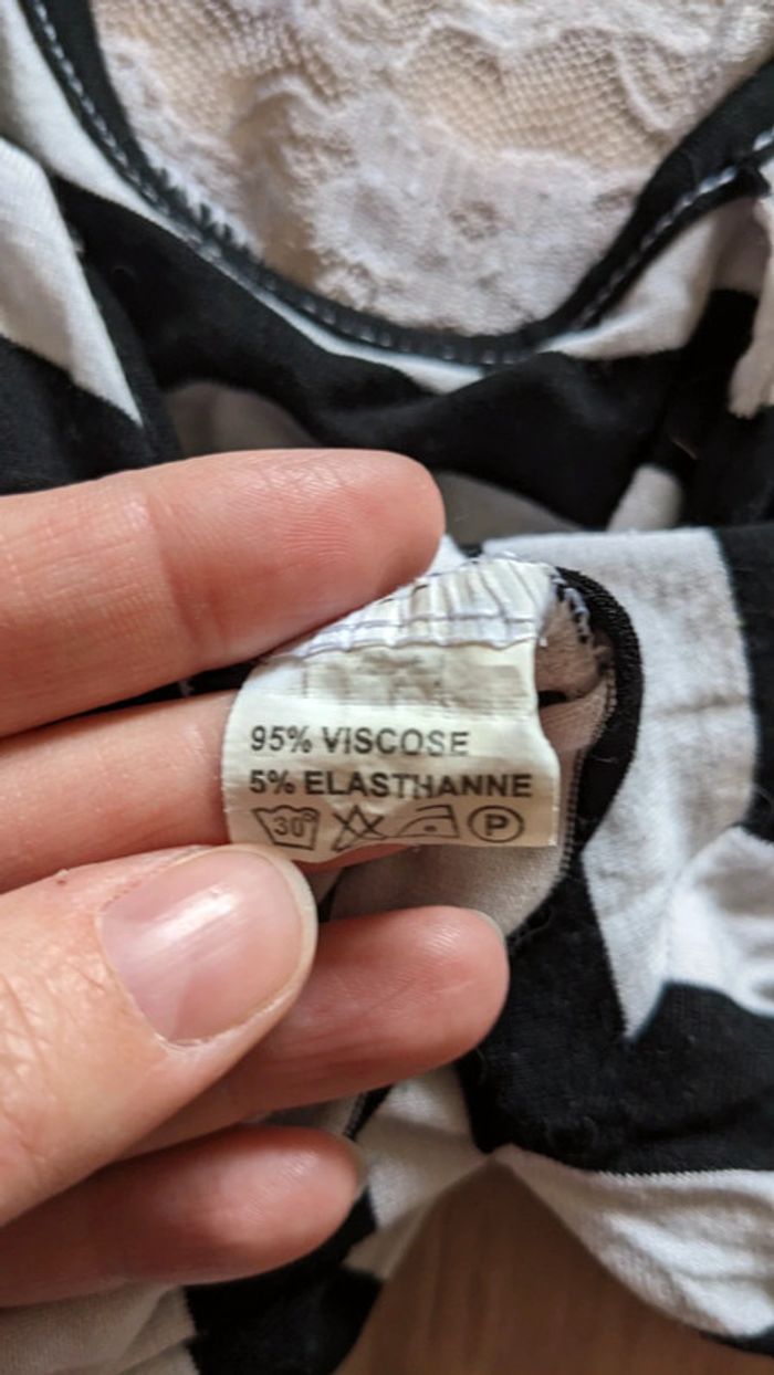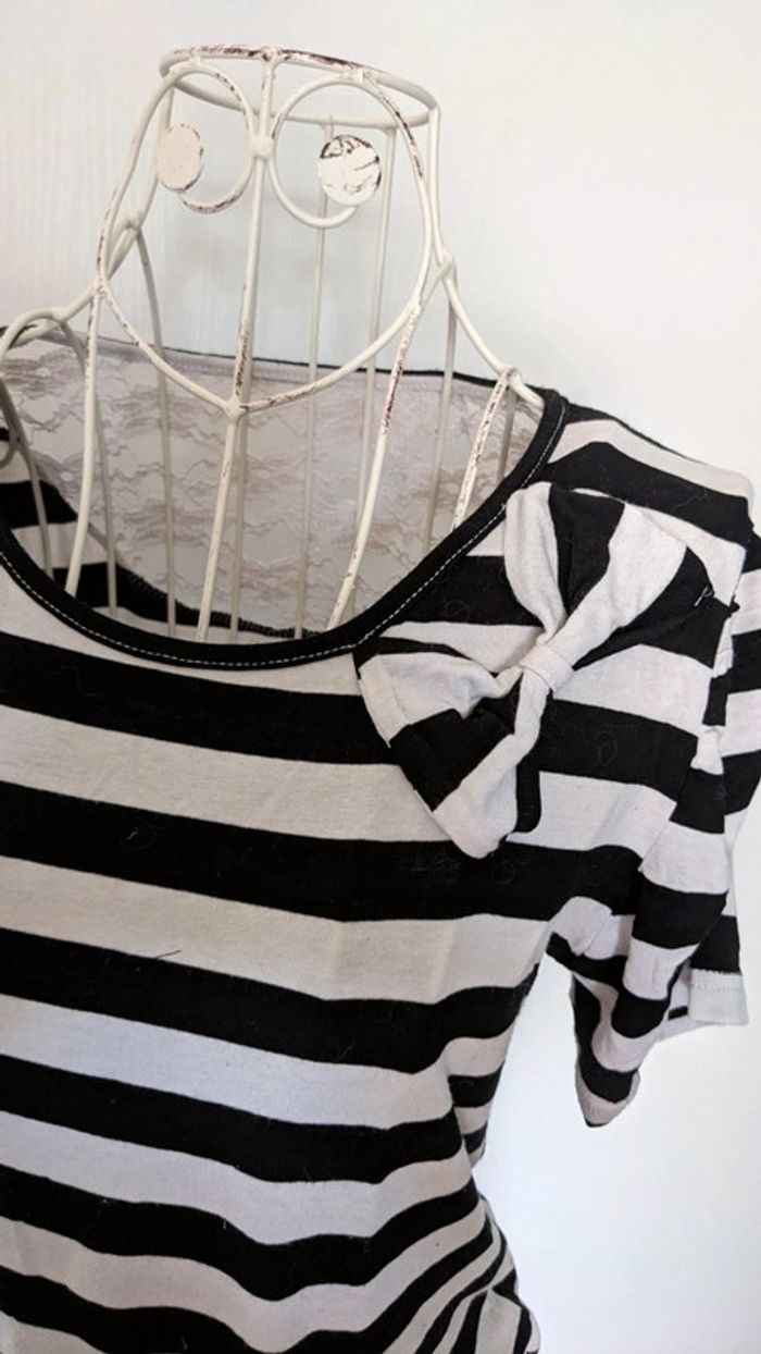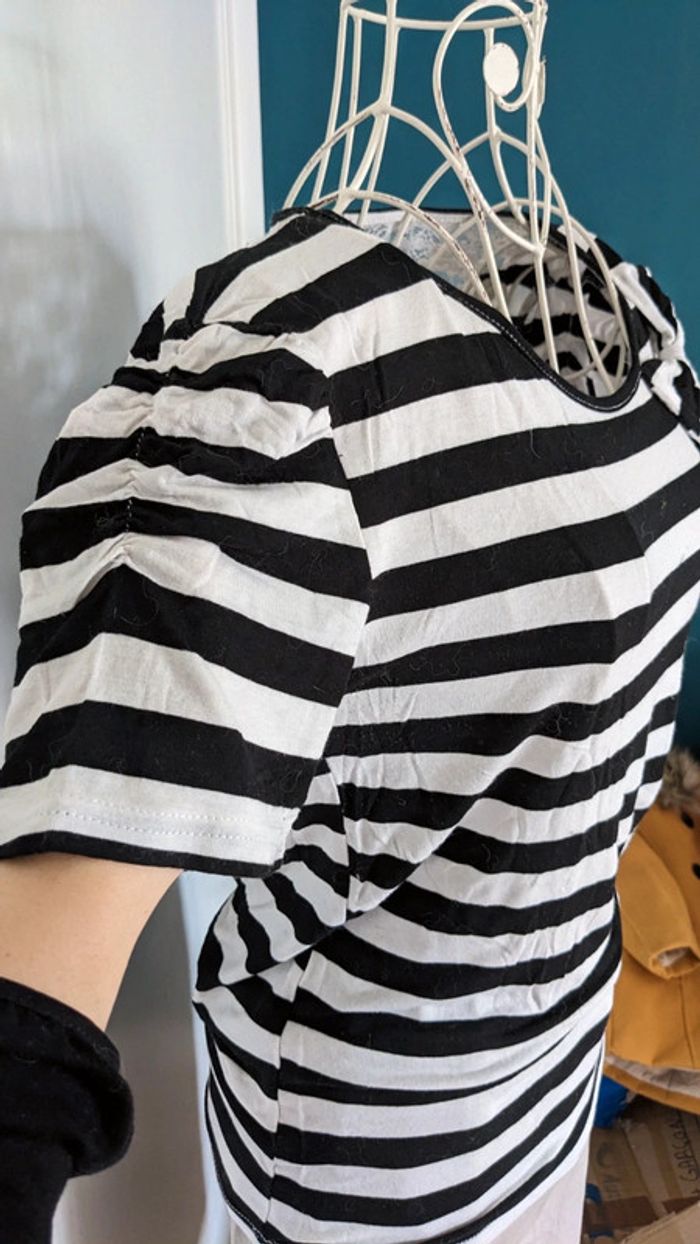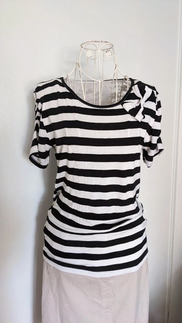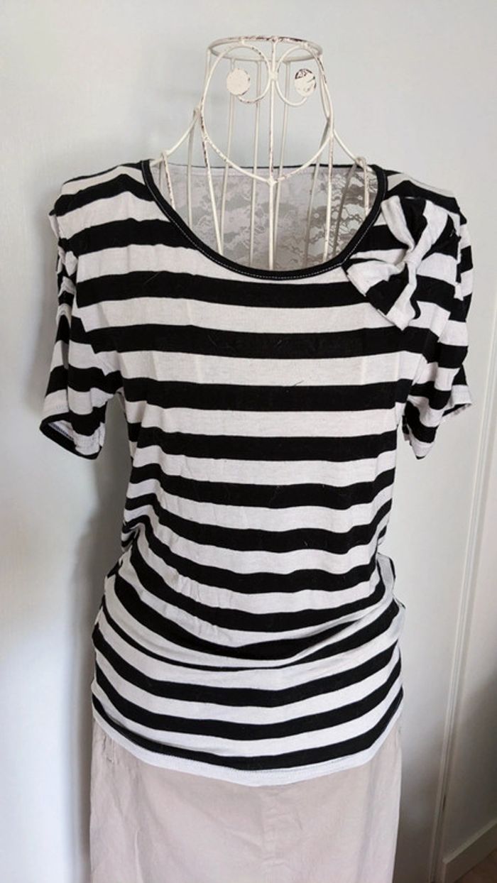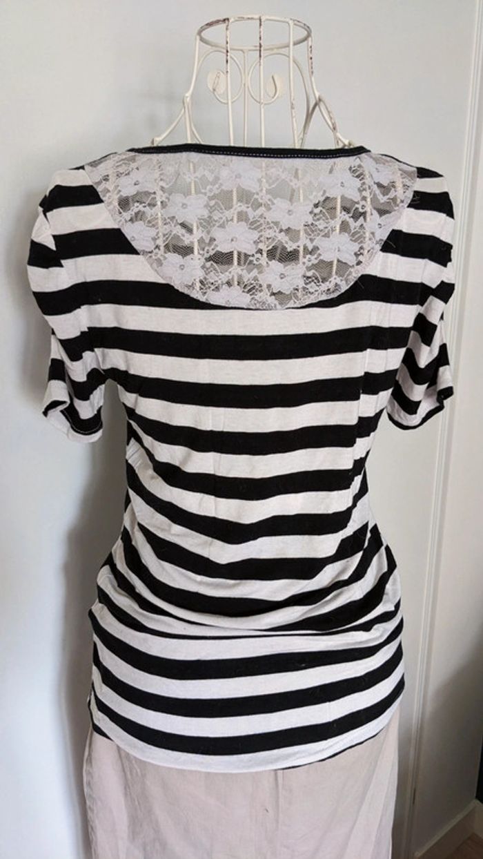 Très bon état Haut des manches froncés, petit noeud à gauche, dentelles dans le dos Grosses réductions sur les lots et beaucoup d'articles dans mon dressing ! Profitez en ! 🤗😉 Dressing trié par taille -> #miladys38 Pour les autres tailles: voir la liste dans la description de mon profil, visitez mon dressing ou demandez moi 😉 #teeshirt #viscose #rayures #noiretblanc #noeud #dentelle Cai 1