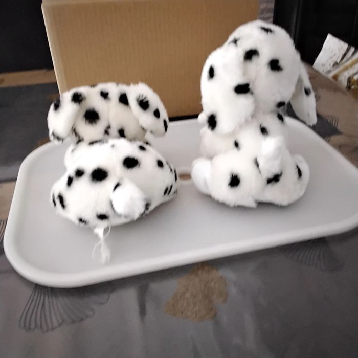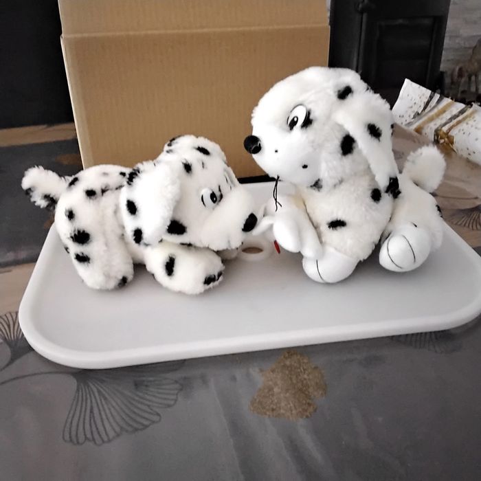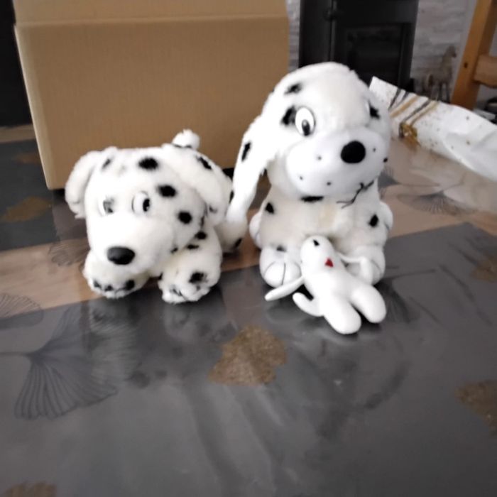 Famille dalmatiens peluche La maman tient son bébé par scratch Hauteur et largeur maman : 17 cm Papa Hauteur 12 cm Largeur 18 cm Année 1990 #lamadelon_jouets_bébé