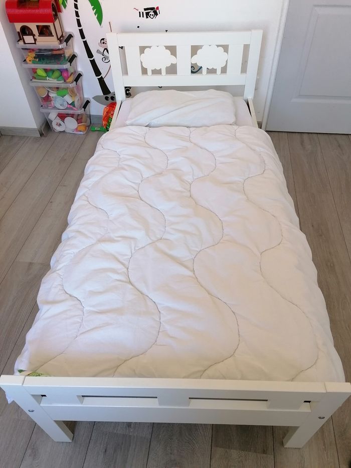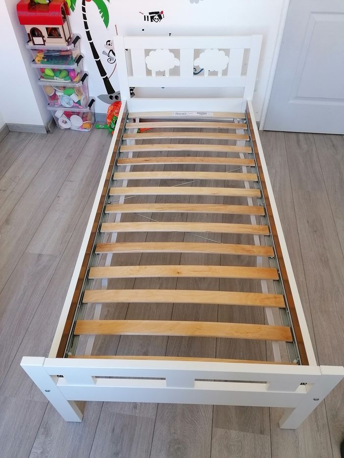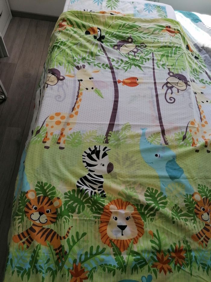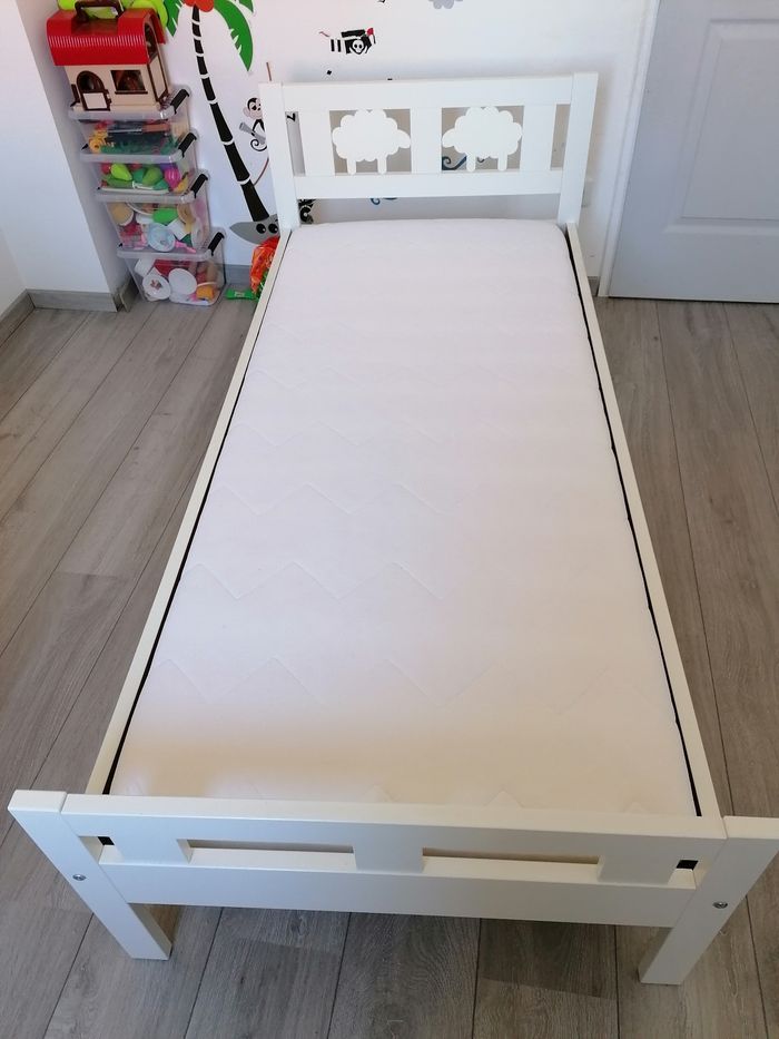 Vend lit enfant mixte 1,60m X 0,70m Dimensions extérieures : 1,655m X 0,775m Hauteur tête de lit au sol : 0,68m Hauteur pied de lit au sol: 0,48m Vendu avec matelas 1,60m X 0,70m déhoussable (housse lavable) + couette + petit oreiller + 2 alèses imperméables + 2 parures de lit (1 pirate et 1 jungle) + 3 draps housse (bleu, vert et blanc).