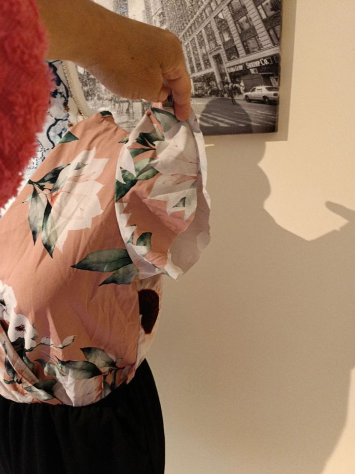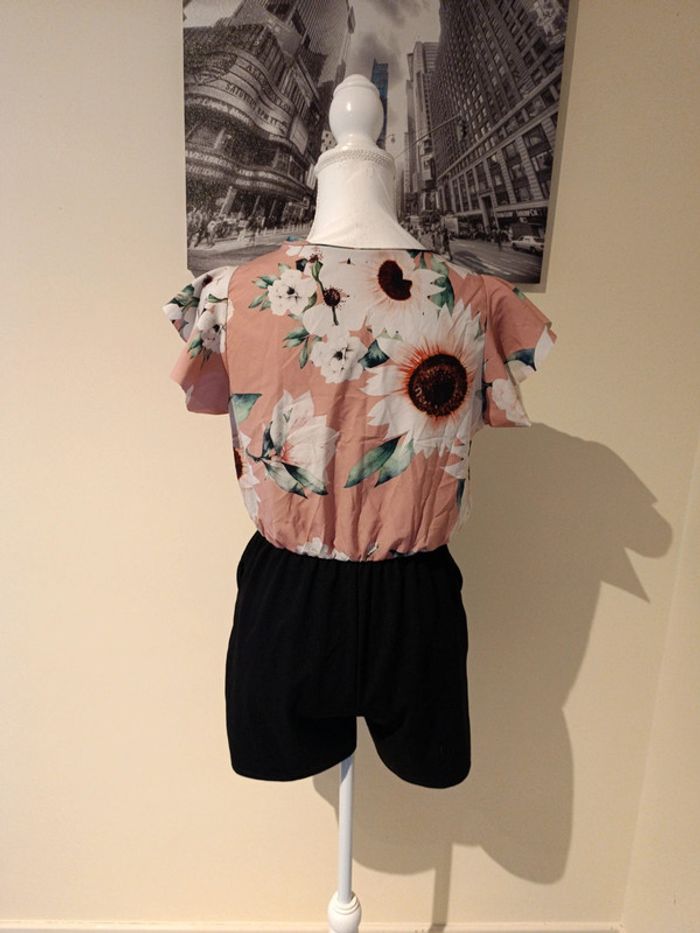 Combi short t 36 ( étiquette manquante)noir et rose , fleurie sur le haut façon cache coeur, tbe
