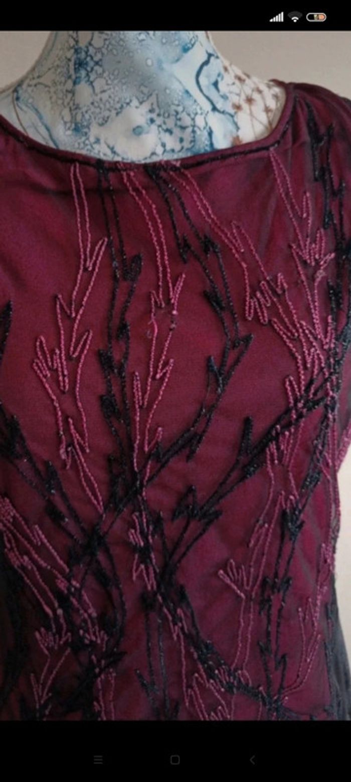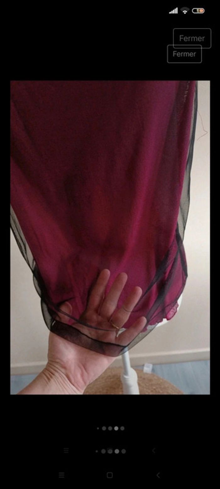 Joli débardeur rouge et noir. Travaillé sur le devant avec des motifs un peu en relief, voile noir transparent sur le derrière. Taille un 42