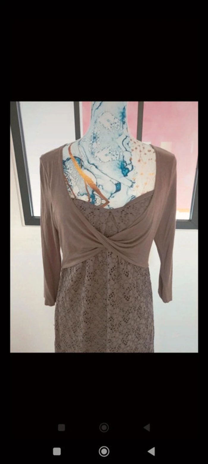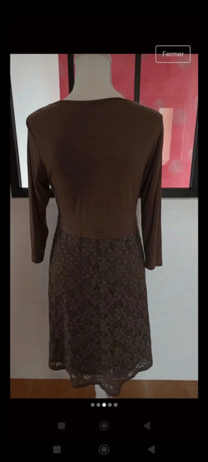 Petite robe marron, effet boléro sur le haut, taille 3, bon état juste un fils de tiré voir dernière photo