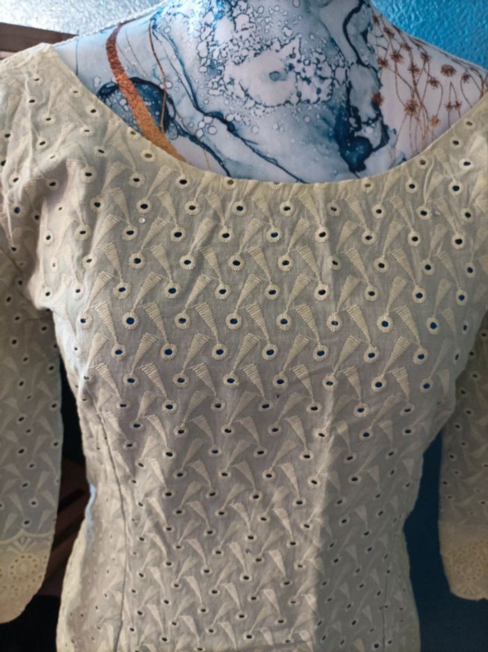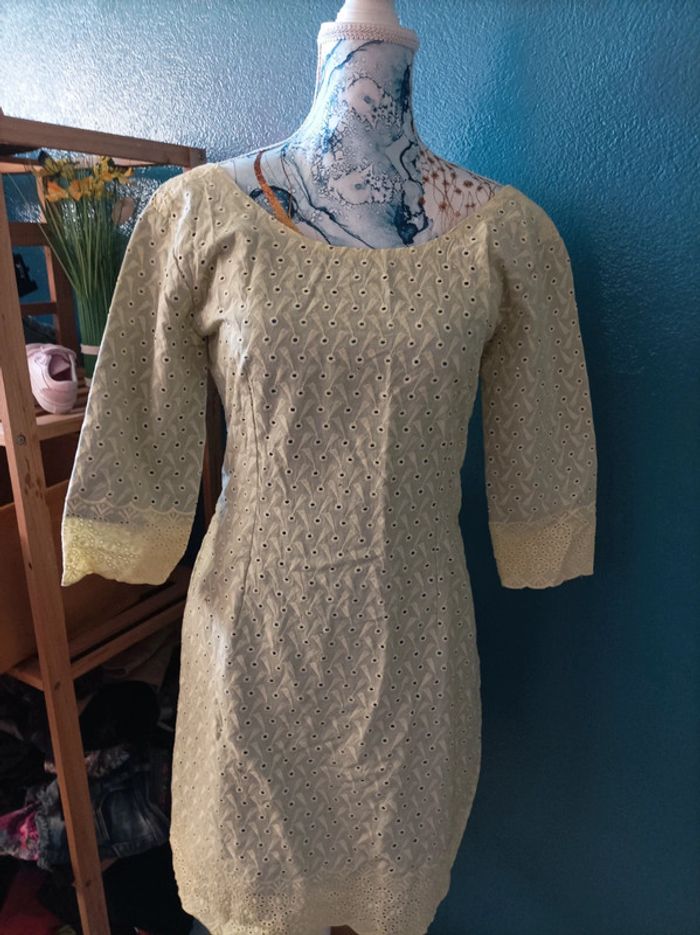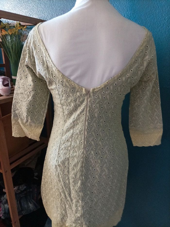 Robe fait main, correspond à un 38, jaune claire double bleu, tbe, quelques brillants sont disposés sur toute la robe #robefaitemain