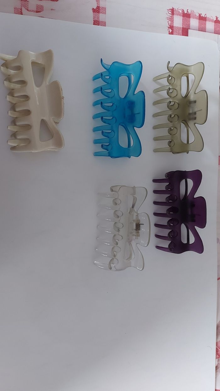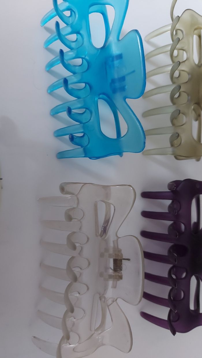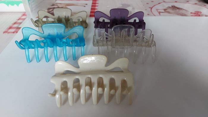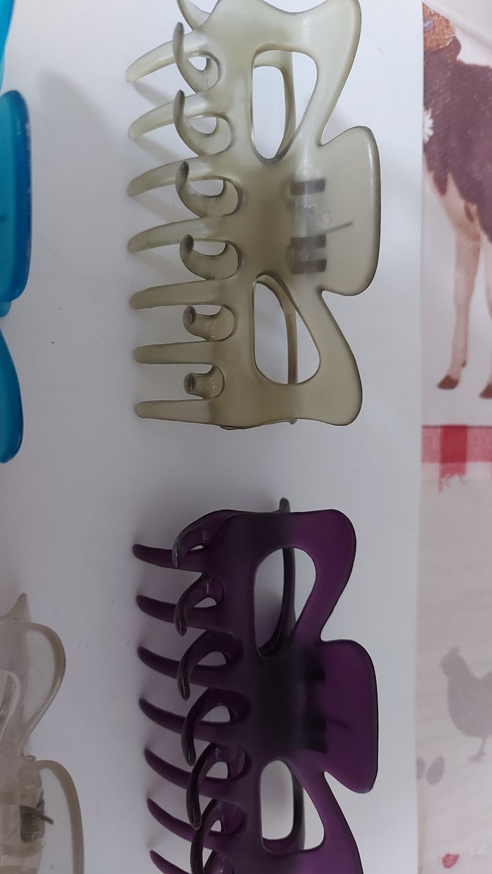 Lot de pinces colorées transparents L 9 cm Mauve neuve Kaki neuve Bleue abîmée Transparente un peu abîmée, refaite sur le haut Pince opaque blanc/bleutée très bon état. A nettoyer