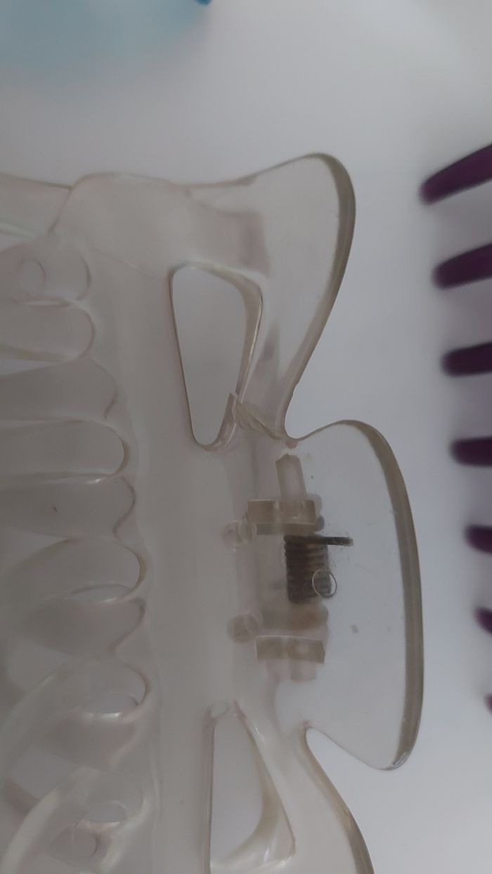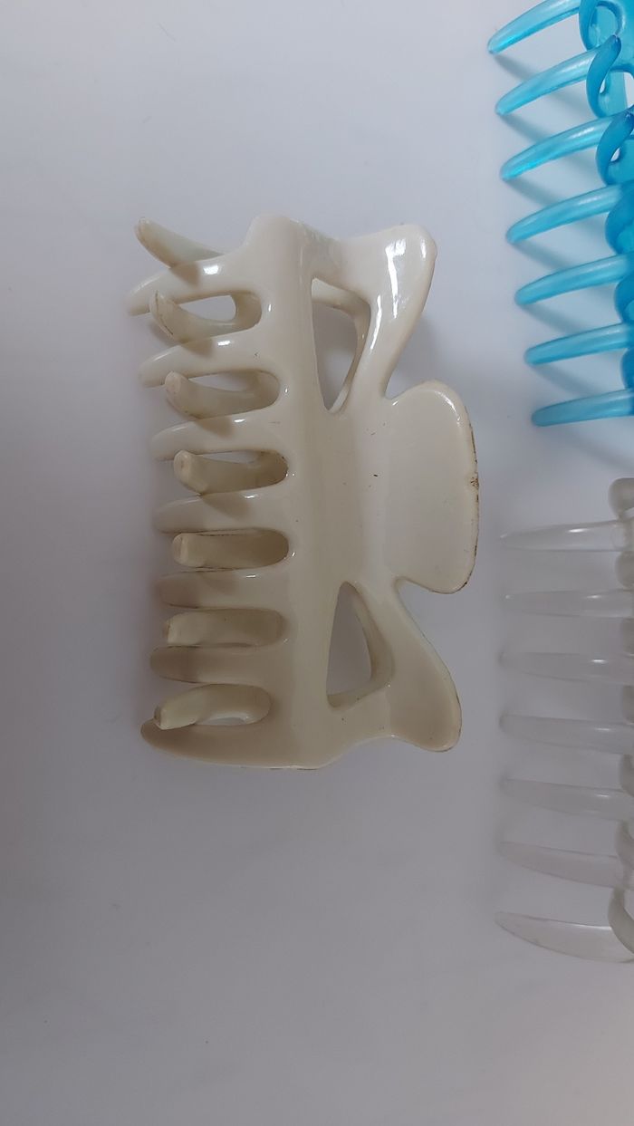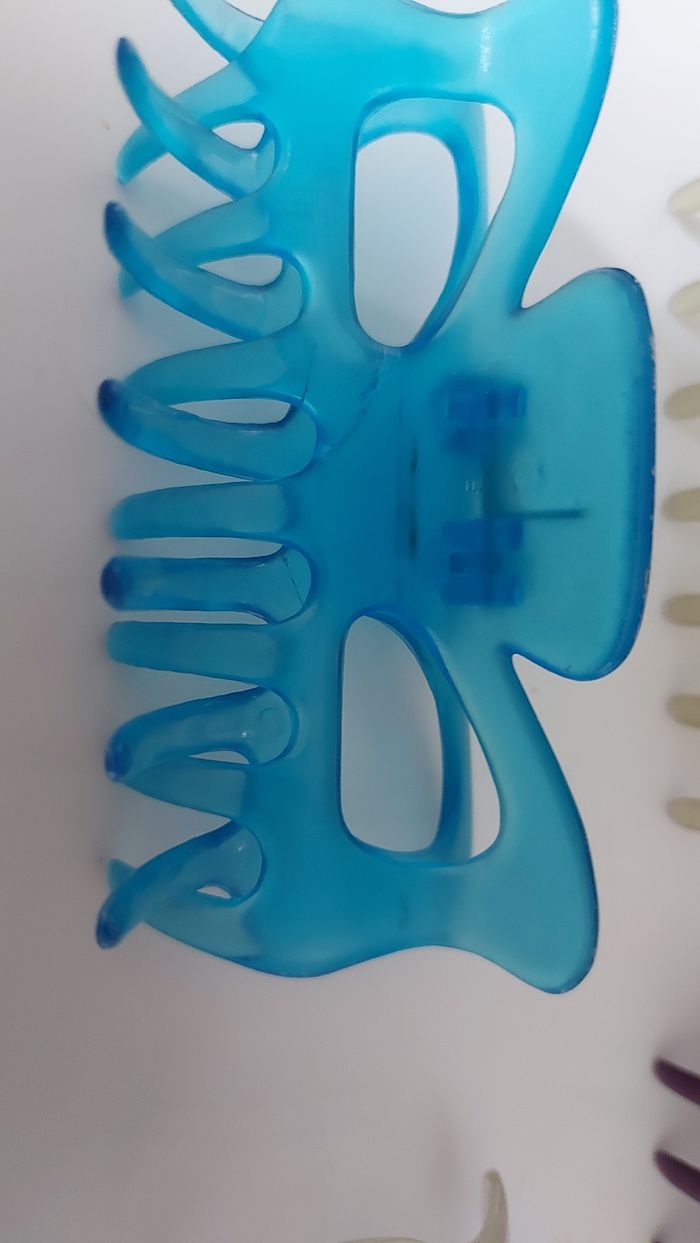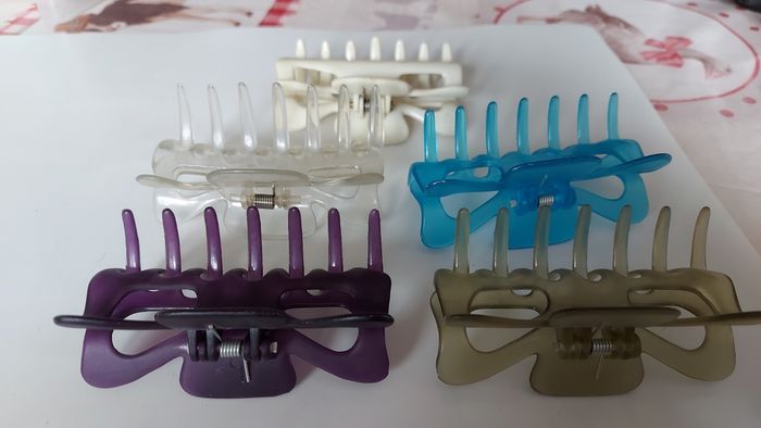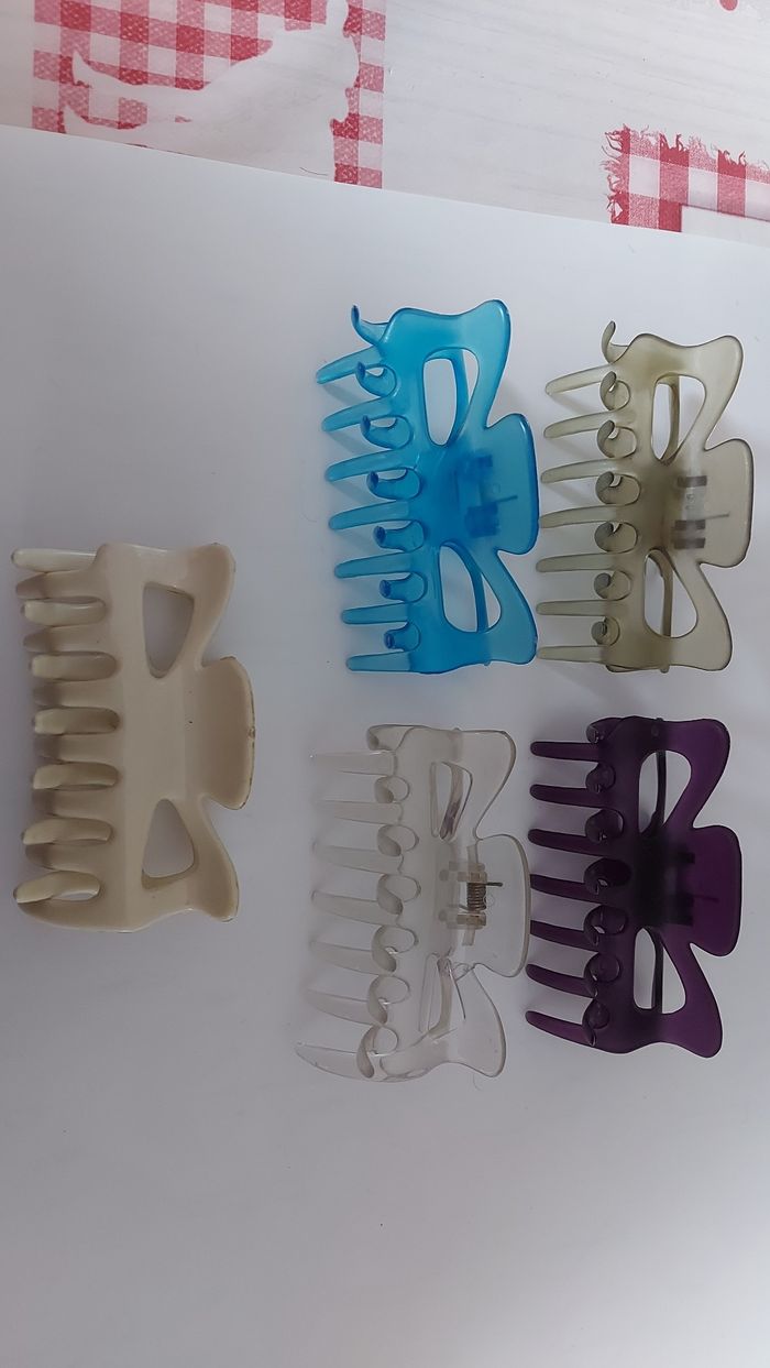 Lot de pinces colorées transparents L 9 cm Mauve neuve Kaki neuve Bleue abîmée Transparente un peu abîmée, refaite sur le haut Pince opaque blanc/bleutée très bon état. A nettoyer