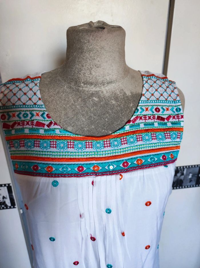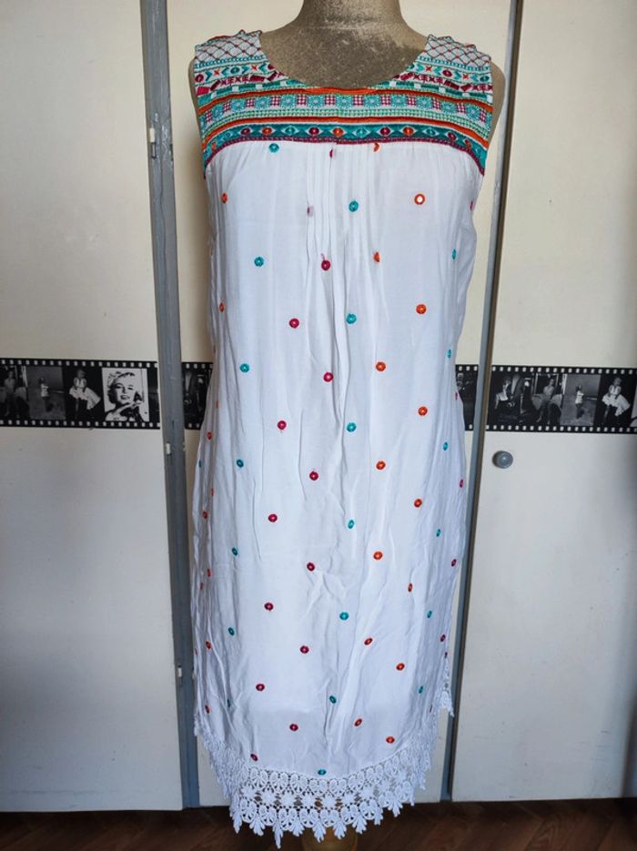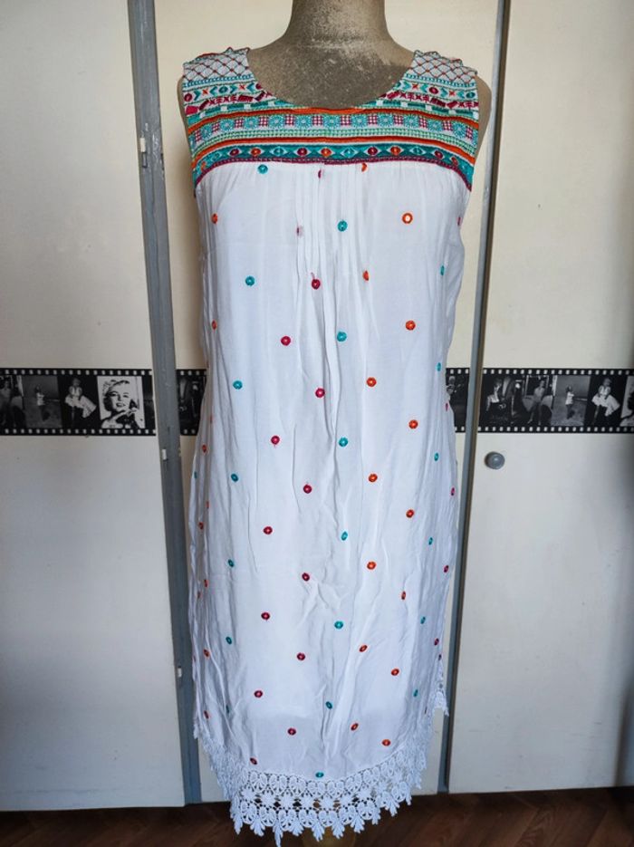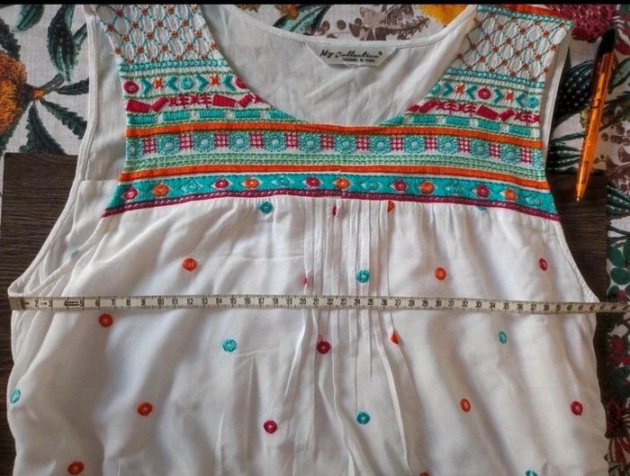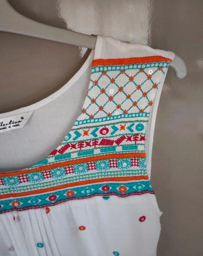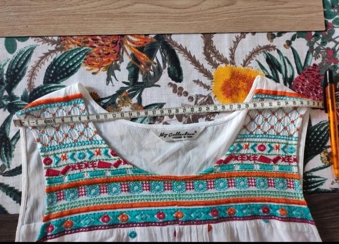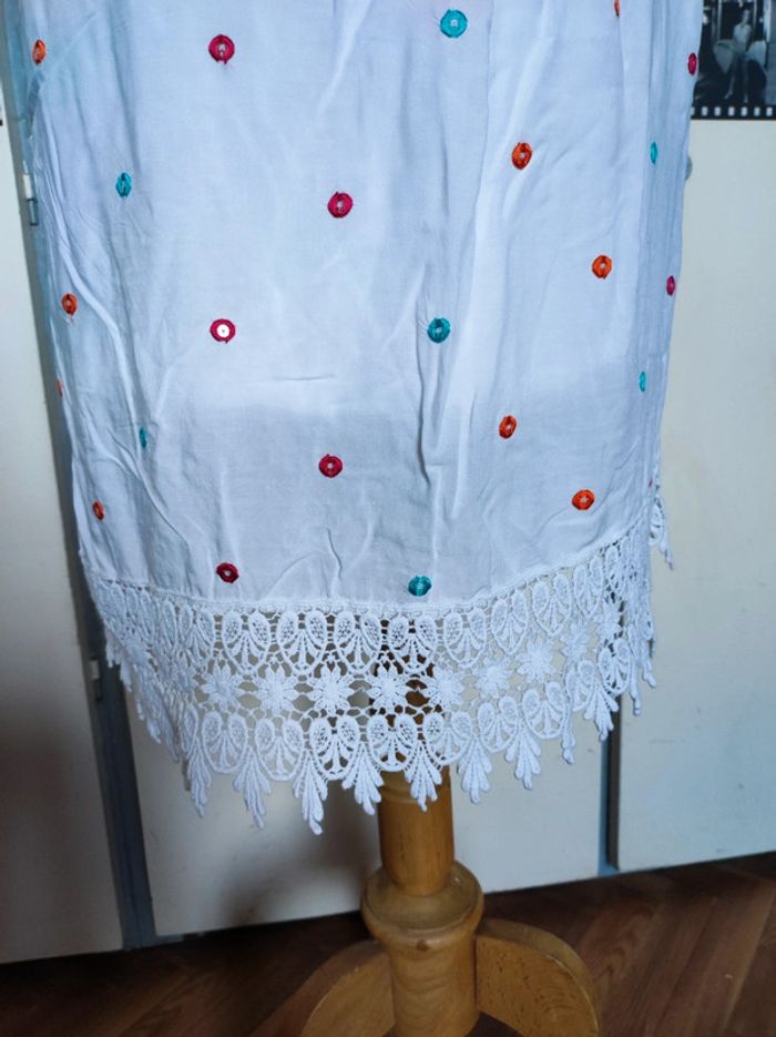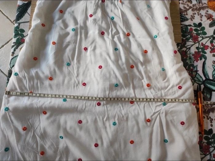 Jolie robe d'été. L'étiquette de la taille est coupée mais pour moi il s'agit d'une taille 40. J'ai pris quelques mesures en photos, n'hésitez pas si vous avez des questions avant de commander (ne faites pas attention, elle est un peu chifonnée sur les dernières photos car je l'avais pliée, mais elle est très belle). #broderie #designedparis #mvasseur74430Femme #effetmiroir #perles