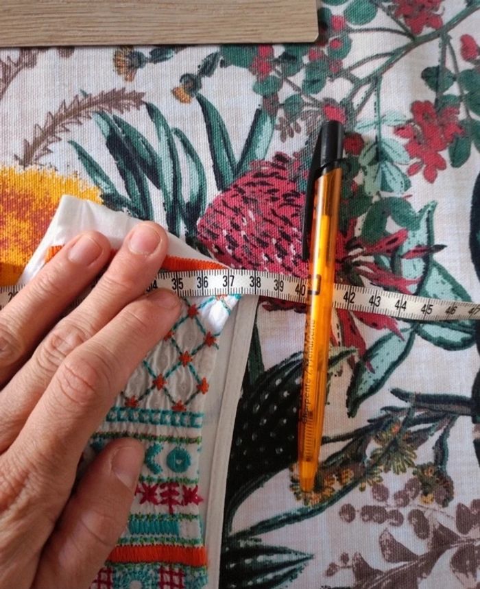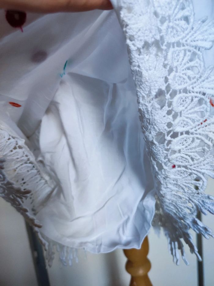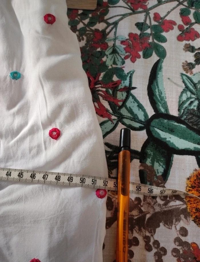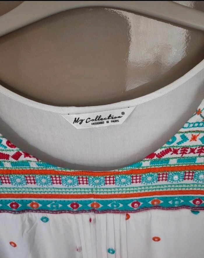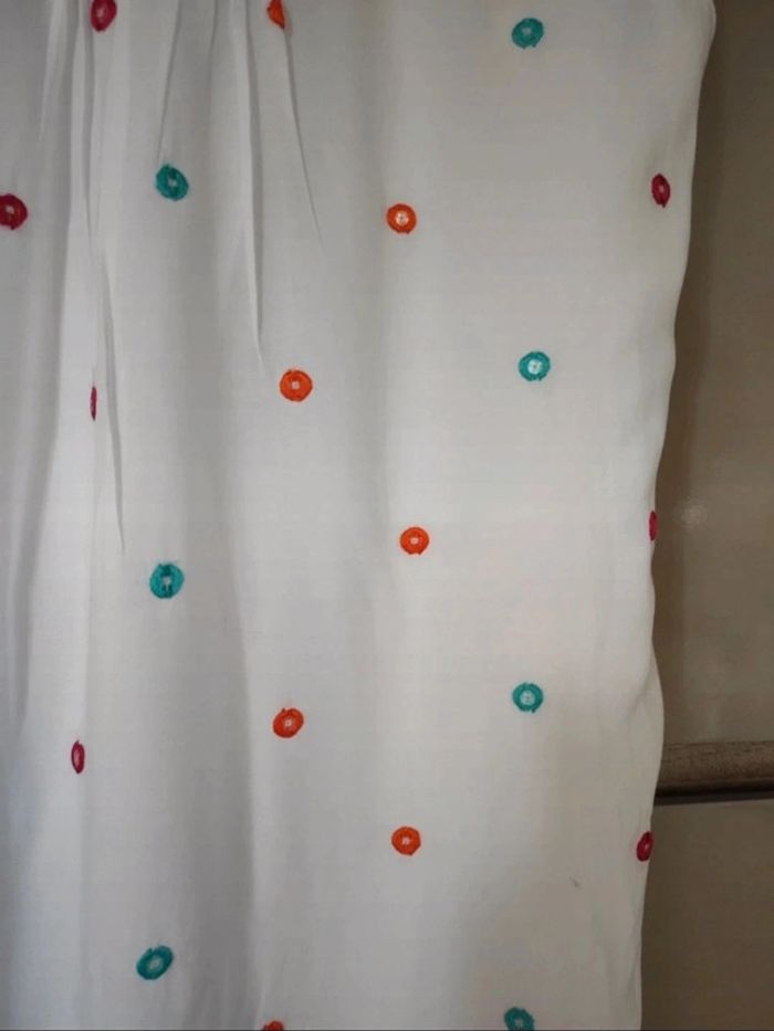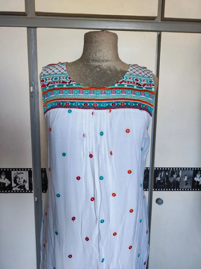 Jolie robe d'été. L'étiquette de la taille est coupée mais pour moi il s'agit d'une taille 40. J'ai pris quelques mesures en photos, n'hésitez pas si vous avez des questions avant de commander (ne faites pas attention, elle est un peu chifonnée sur les dernières photos car je l'avais pliée, mais elle est très belle). #broderie #designedparis #mvasseur74430Femme #effetmiroir #perles