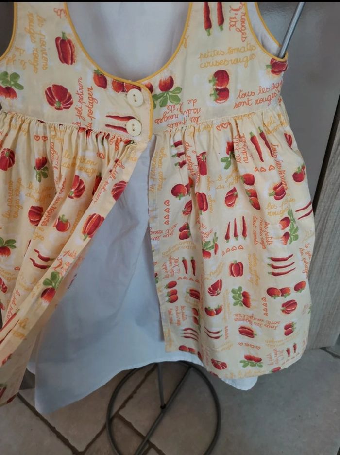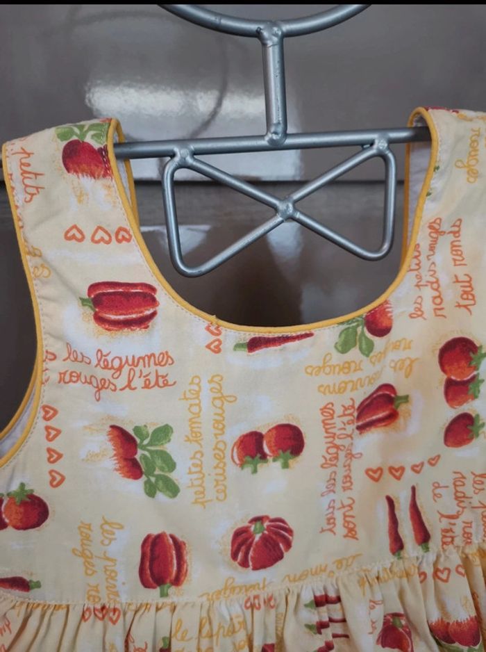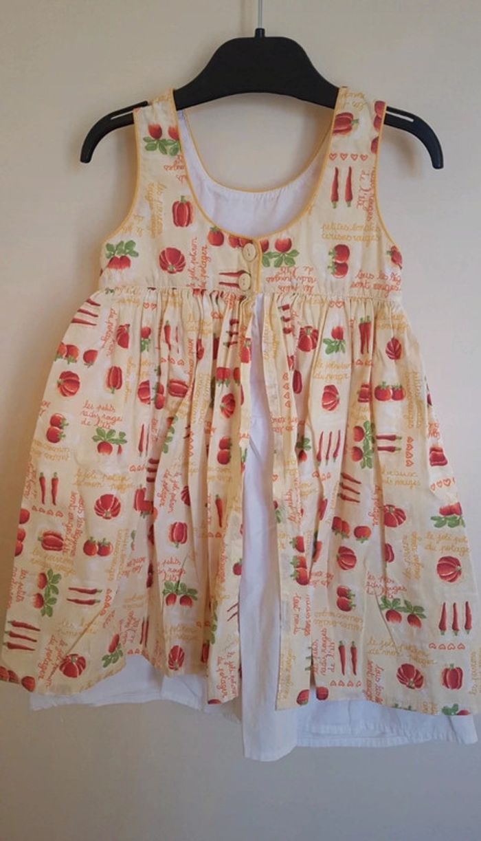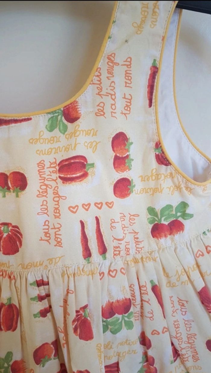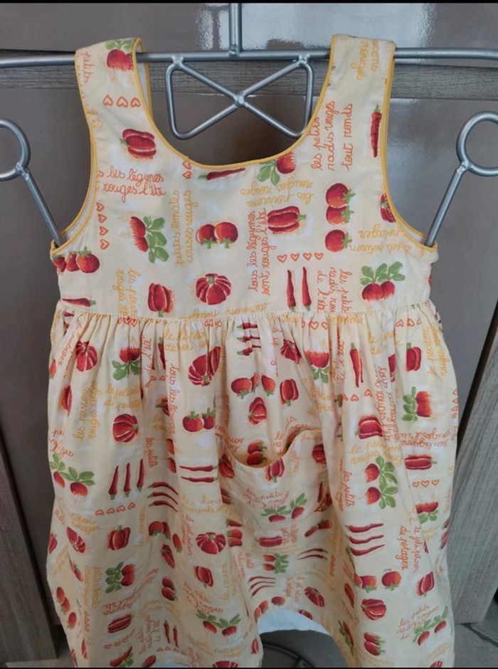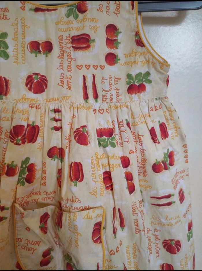 Petite Robe d'été. Il s'agit d'une taille 3 ans. Les petits juniors, chez dpam. Sur le col, ce n'est pas un trou, ça fait comme un arrêt de couture, ce n'est pas choquant une fois portée. #été #mvasseur74430bébéF #légumes #motifs #orange #jaune #vert #rouge