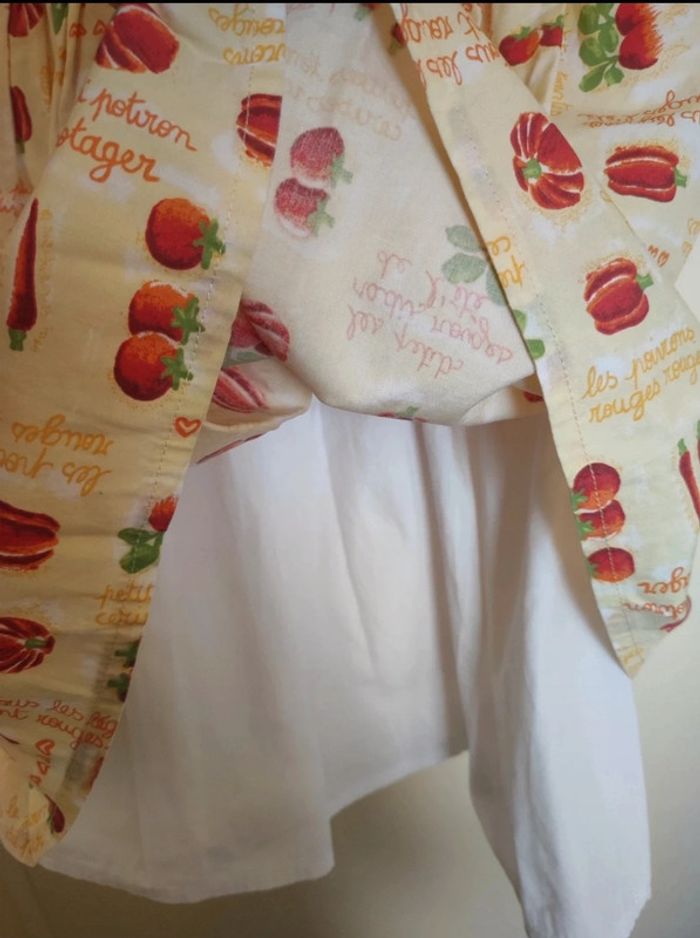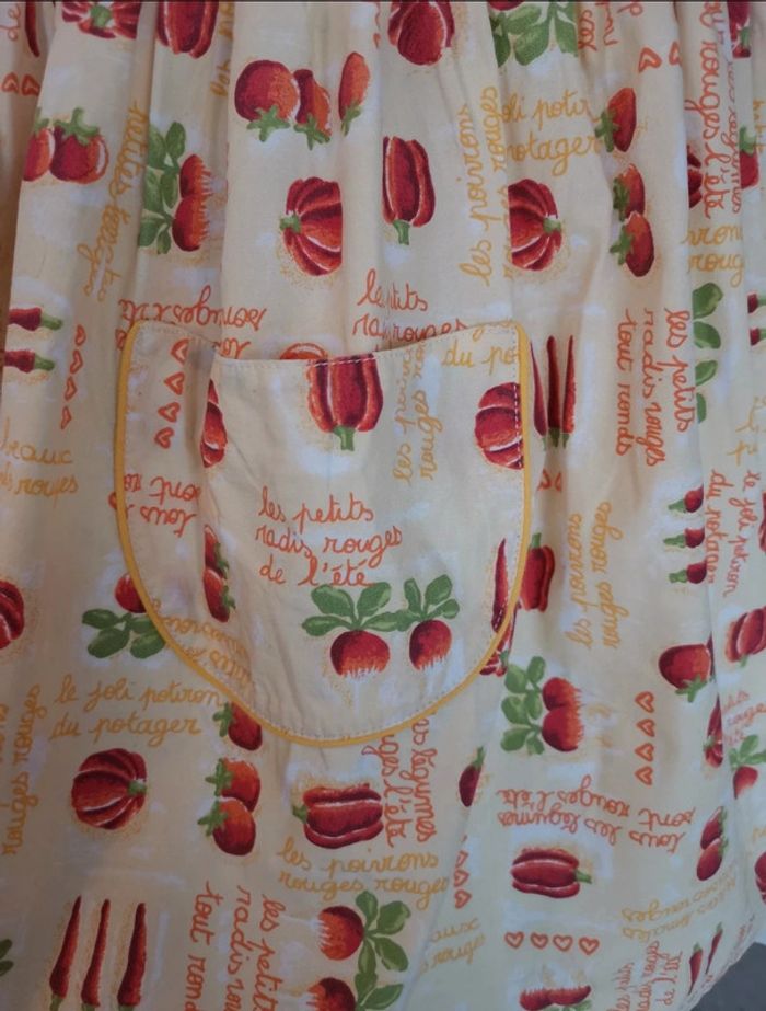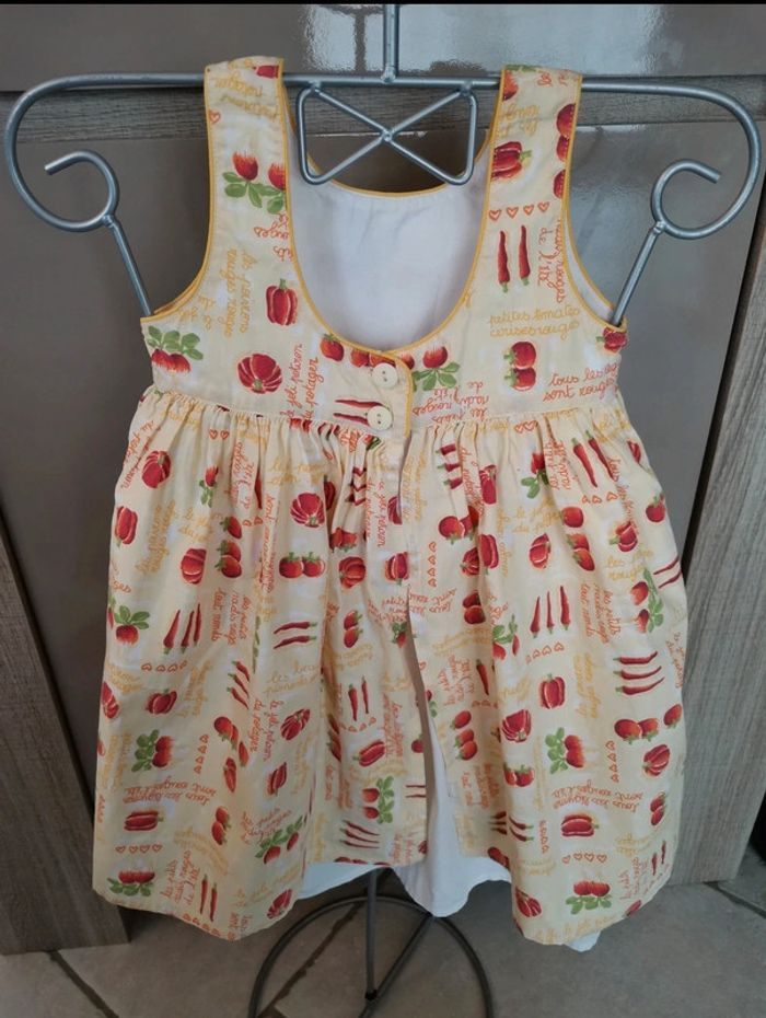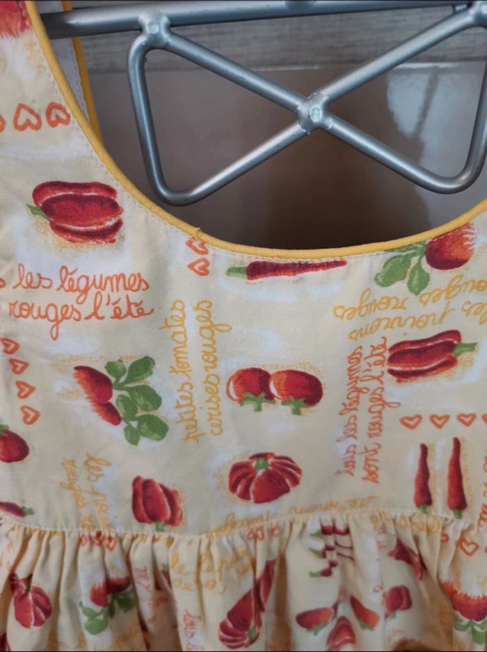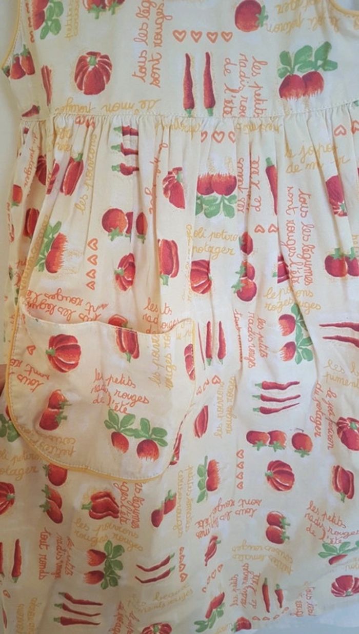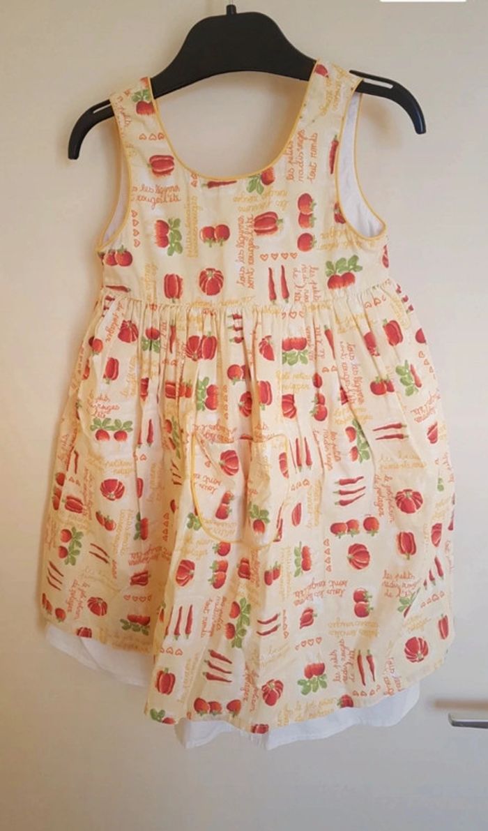 Petite Robe d'été. Il s'agit d'une taille 3 ans. Les petits juniors, chez dpam. Sur le col, ce n'est pas un trou, ça fait comme un arrêt de couture, ce n'est pas choquant une fois portée. #été #mvasseur74430bébéF #légumes #motifs #orange #jaune #vert #rouge