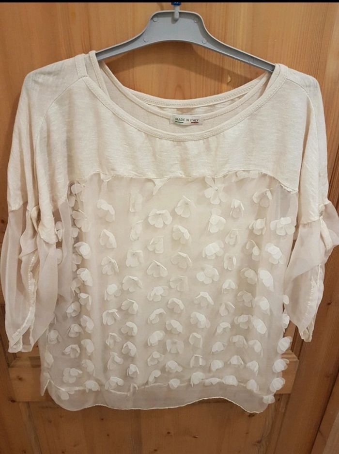 Haut tunique avec débardeur en dessous. Tons beige. Sympa avec un jean. Taille unique . #fleurs #transparence #mariage #baptême #mvasseur74430Femme