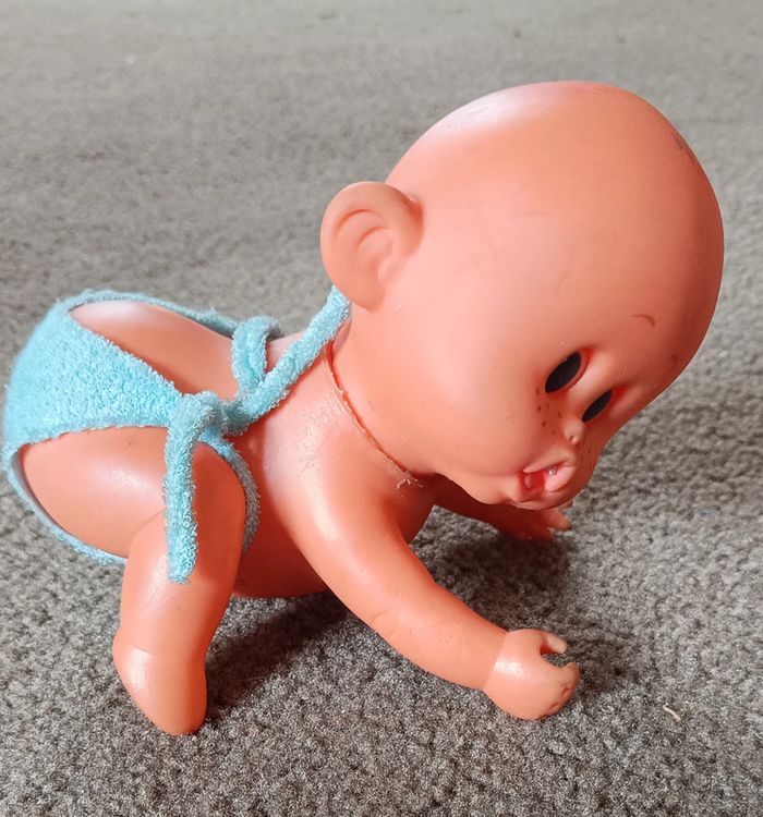 Poupon-Poupee Vintage Farmi Poupon-Poupee Vintage Farmi - Poupées RARE. ANNEE 70-80. ENVIRON 14 CM DE HAUT SUR 17 CM DE LONG. AVEC SON PETIT BAVOIR EN FEUTRINE. jouet, vintage, objet de collection figurine vintage collection collector maison non fumeur et sans animaux n'hésitez pas à faire des lots