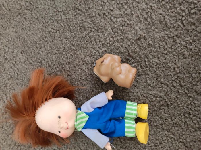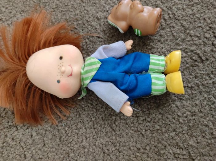 poupée charlottes aux fraises huckleberry pie + figurine chien clafouti pistache clafouti myrtilles 1979 american greetings avec chaussures et son chien collector, collection vintage n'hésitez pas a faire des lots