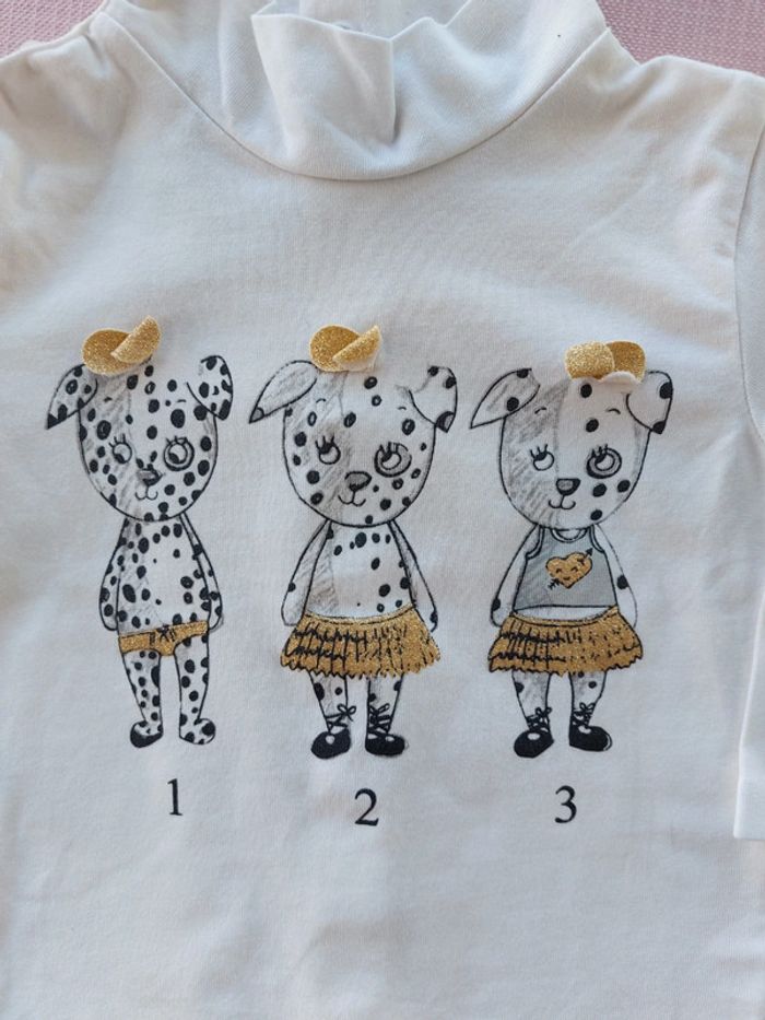#laetitia8110filleT9mois T-shirt avec des petits chiens. Se ferme à l arrière avec des boutons pressions.