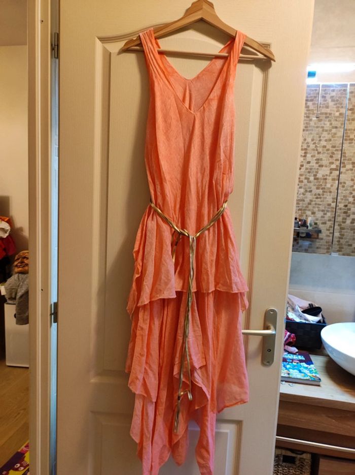 robe longue corail rose ceinture dorée manches courtes volants taille s femme jeune fille maison non fumeur et sans animaux n'hésitez pas à faire des lots