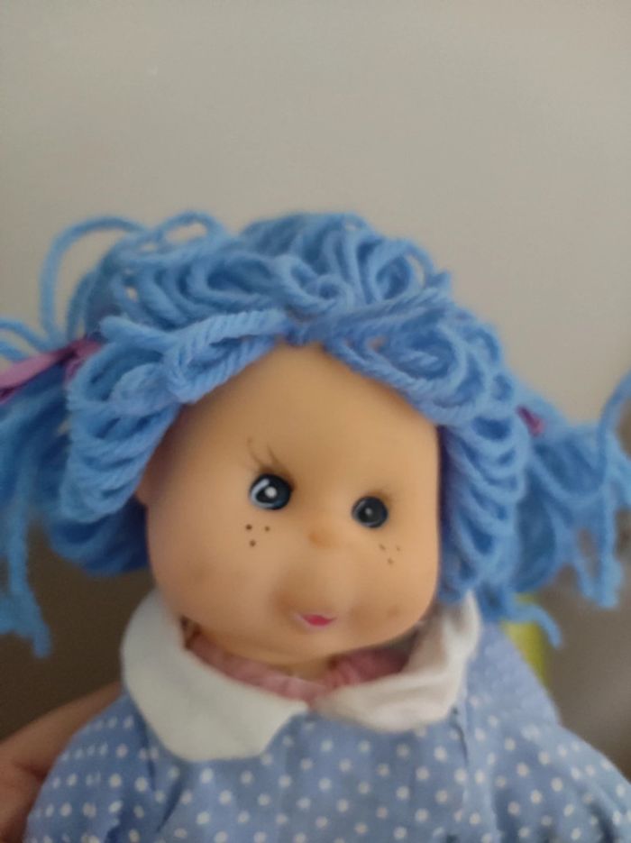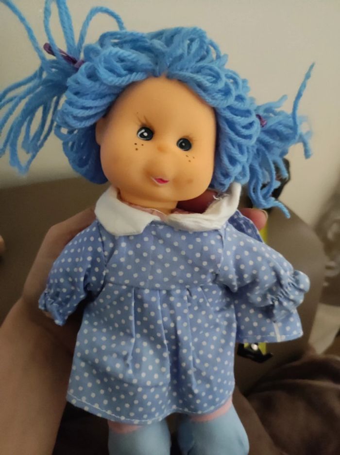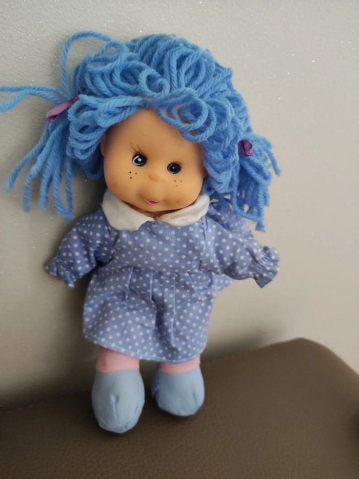 poupée chiffon bleu laine ancienne robe bleu pois blanc rainbow vintage collector collection maison non fumeur et sans animaux n'hésitez pas à faire des lots