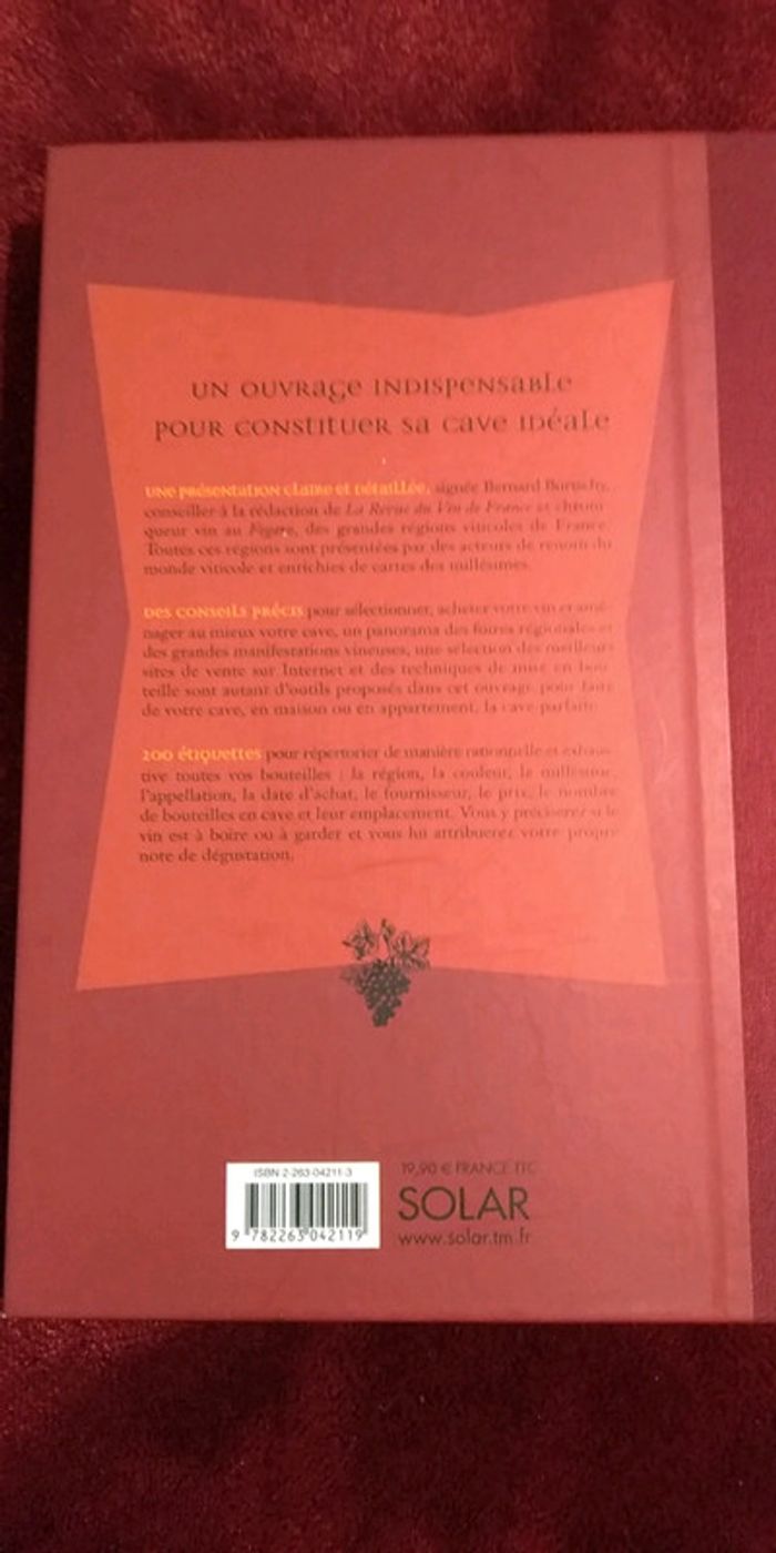 Livre vin Mon livre de cave Bernard Burtschy SOLAR Neuf, idéal cadeau de Noël Maison non fumeur et sans animaux Une présentation claire et détaillée des grandes régions viticoles de France. Toutes ces régions sont présentées par des acteurs de renom du monde viticole et enrichies de cartes des millésimes. Des conseils précis pour sélectionner, acheter votre vin et aménager au mieux votre cave, un panorama des foires régionales et des grandes manifestations vineuses, une sélection des meilleurs sites de vente sur Internet et des techniques de mise en bouteille sont autant d'outils proposés dans cet ouvrage pour faire de votre cave la cave parfaite. 200 étiquettes pour répertorier de manière rationnelle et exhaustive toutes vos bouteilles : la région, la couleur, le millésime, l'appellation, la date d'achat, le fournisseur, le prix, le nombre de bouteilles en cave et leur emplacement. Vous y préciserez si le vin est à boire ou à garder et vous lui attribuerez votre propre note de dégustation. Oenologie N'hésitez pas à faire des lots