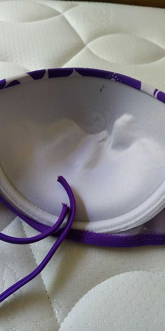 Maillot de bain violet, indiqué taille 44 mais taille petit correspond plus à une taille 40. Excellent état, juste voir dernière photo, mini tâche à l'intérieur du haut qui n'est pas du tout visible lorsque le maillot de bain est porté. Et sur attache du cou (voir dernière photo), légèrement blanc visible mais vraiment très léger. Sinon état impeccable
