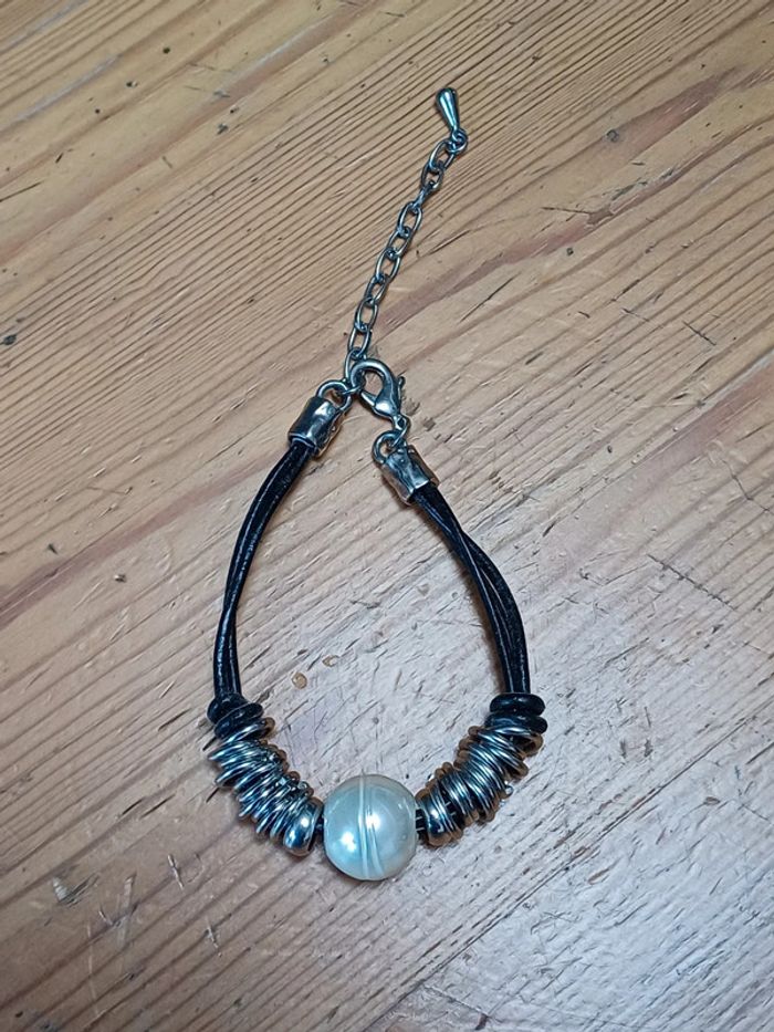 Bracelet fantaisie composé de 3 cordons noirs, de petits anneaux noirs ou argentés et d'une grosse perle. Longueur du bracelet = 19 à 24 cm.