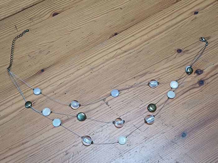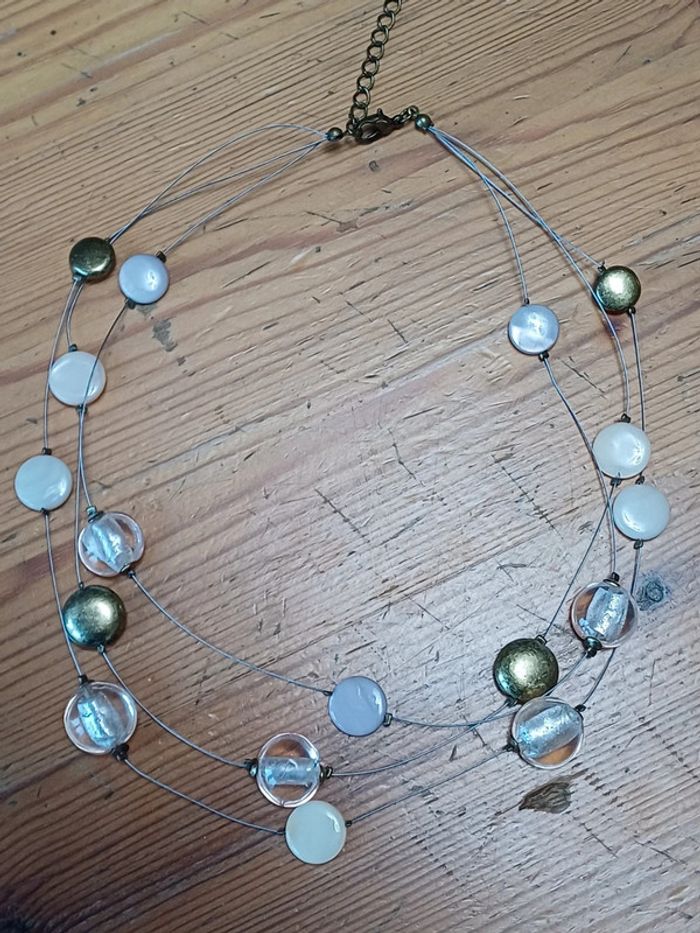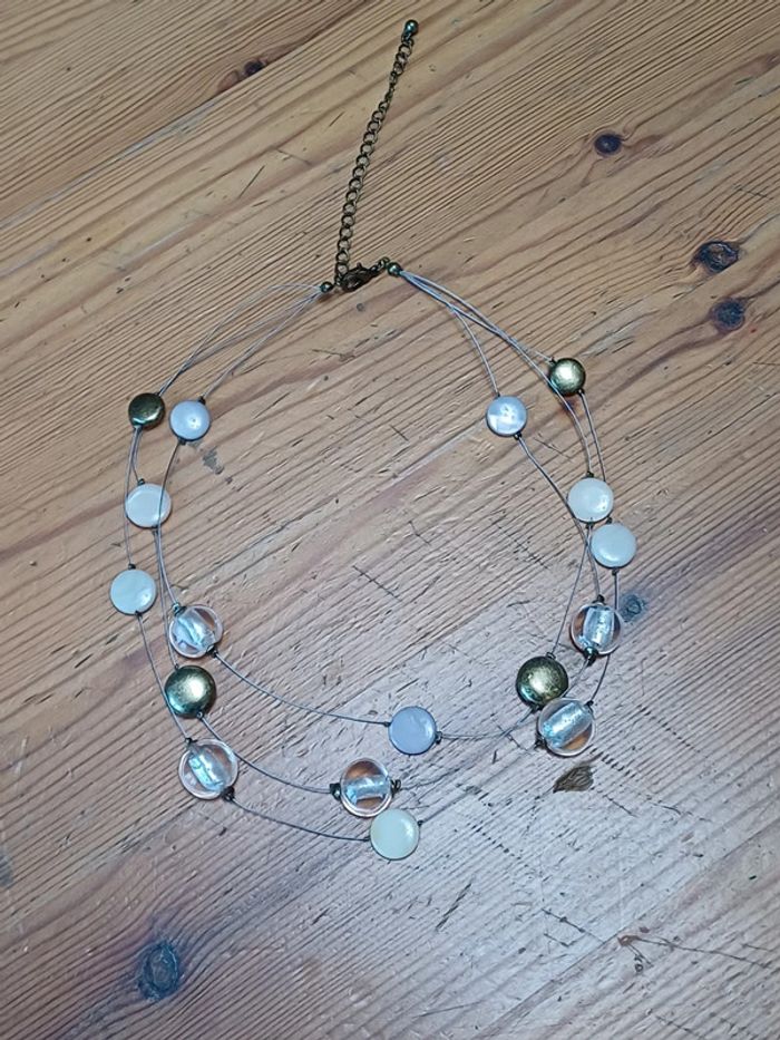 Collier fantaisie ras du cou avec 3 fils métalliques avec des perles blanches, transparentes ou dorées. Longueur du collier = 36 à 47 cm.