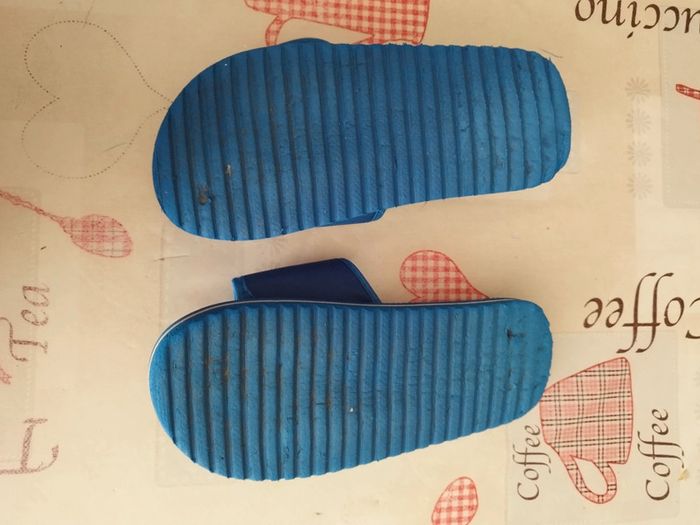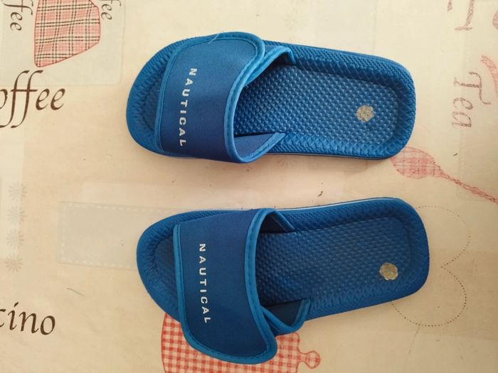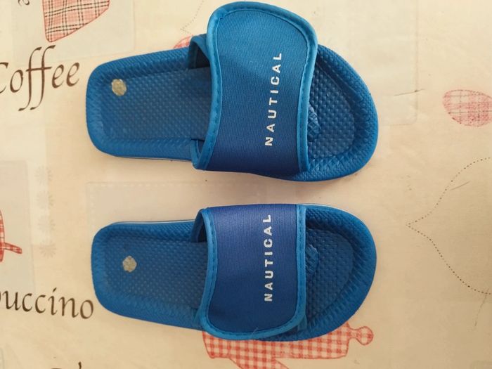 Paire de claquettes en bon état avec un scratch sur le dessus. Pointure 29/30.
