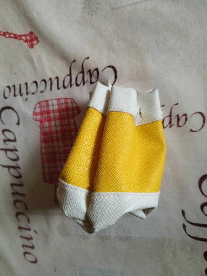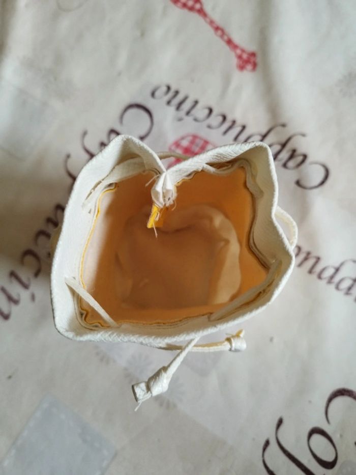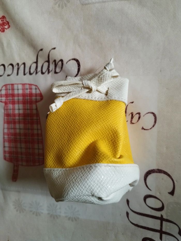 Bourse jaune et blanche avec un lien pour la fermer.