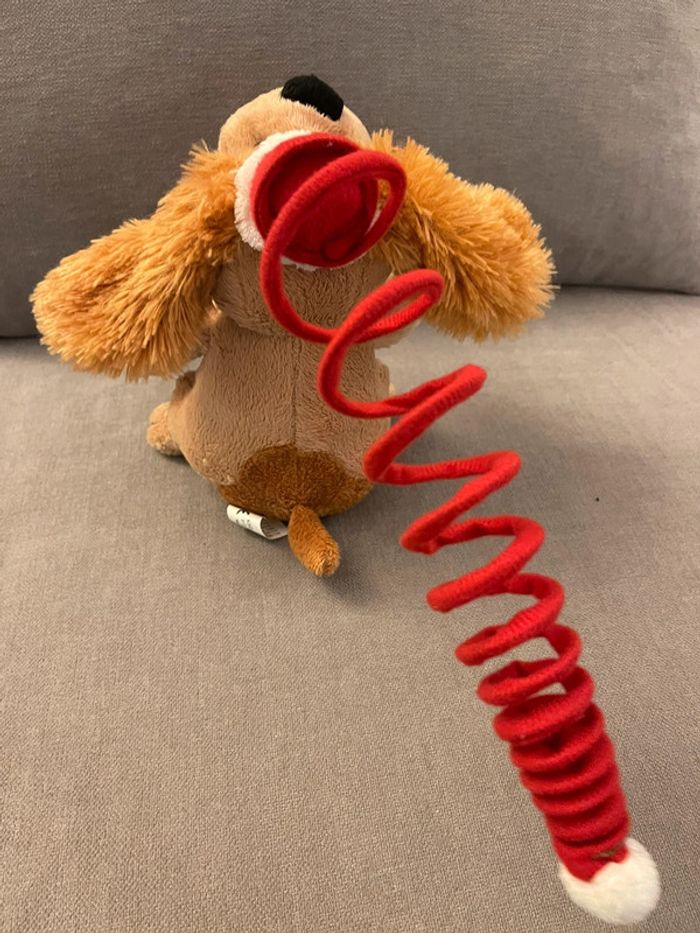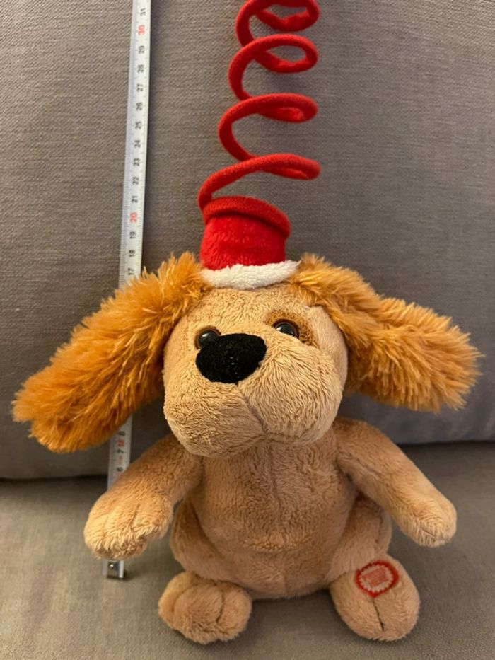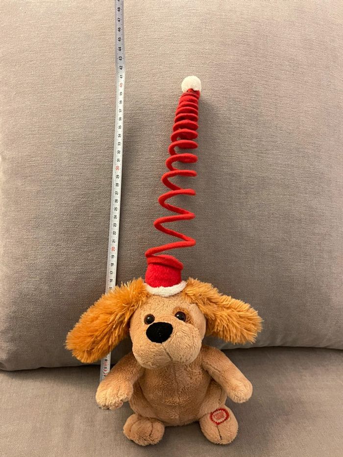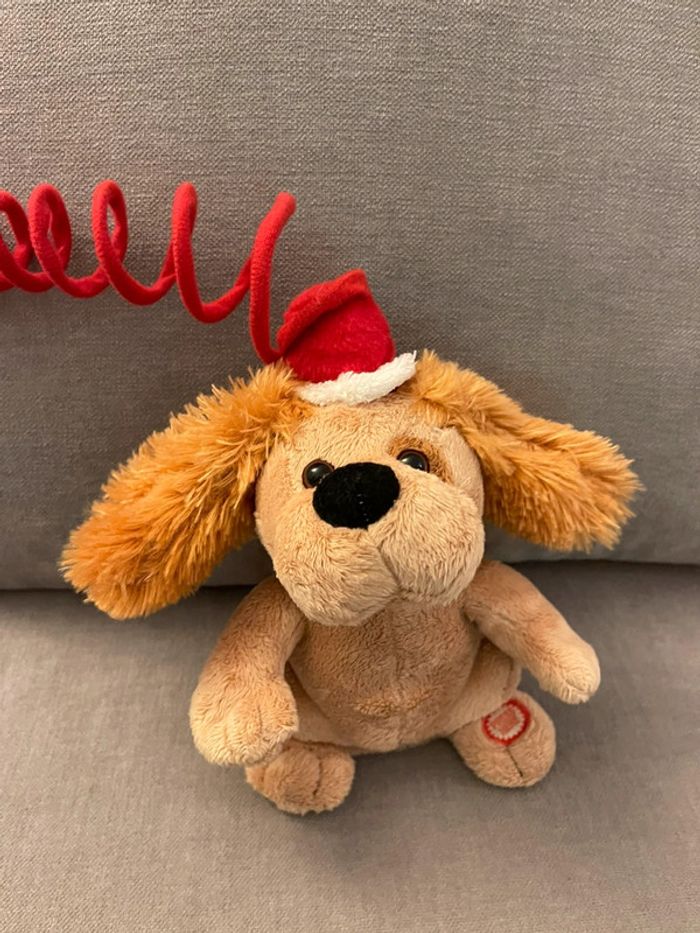 peluche petit chien Noël avec chapeau ressort rouge - rigolo - avec piles mais désormais, ne fonctionne plus
