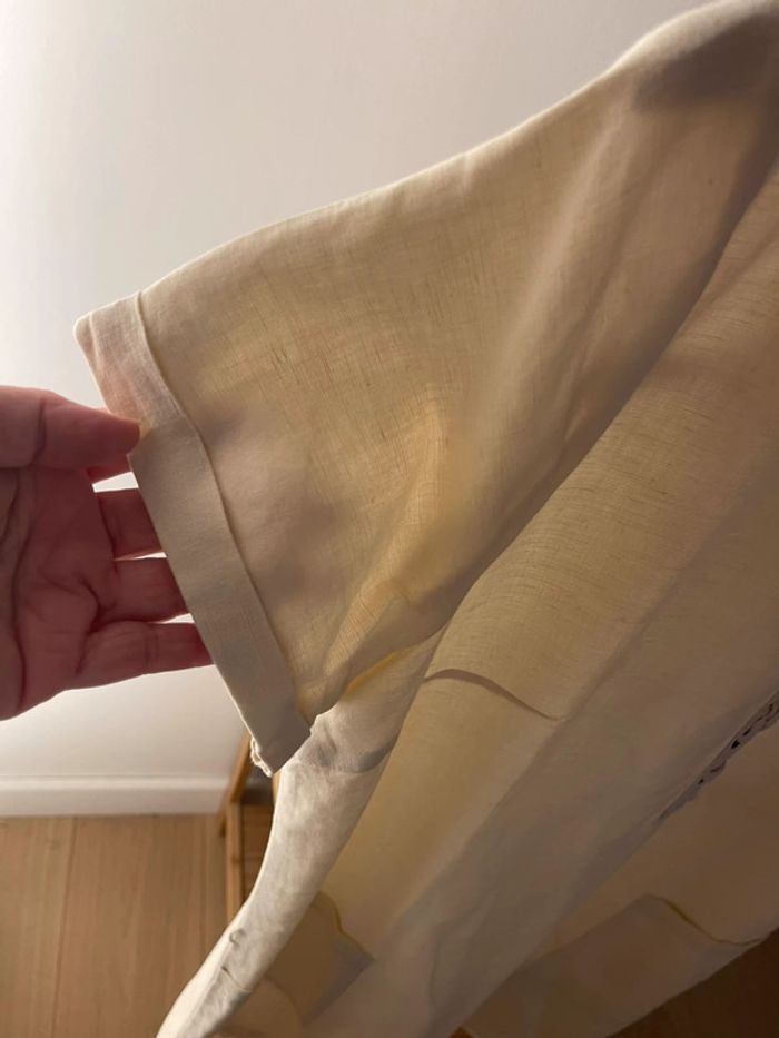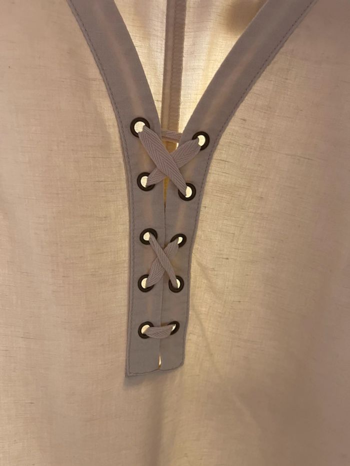 robe droite avec lacets en dessous du décolleté, 2 poches et fermeture éclair sur le côté.Hauteur de 94 cm et tour au niveau des aisselles de 116 cm. Étiquette coupée