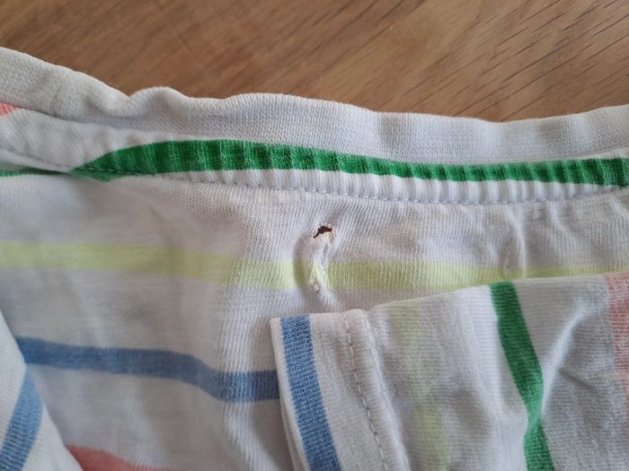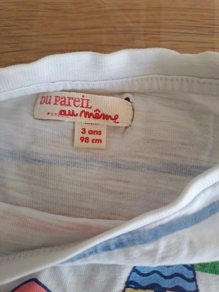 Beau t-shirt, porté. Il a une petite tâche devant et des petits trous se forment autour de l'étiquette à l'arrière. #3ansGarçonLorel
