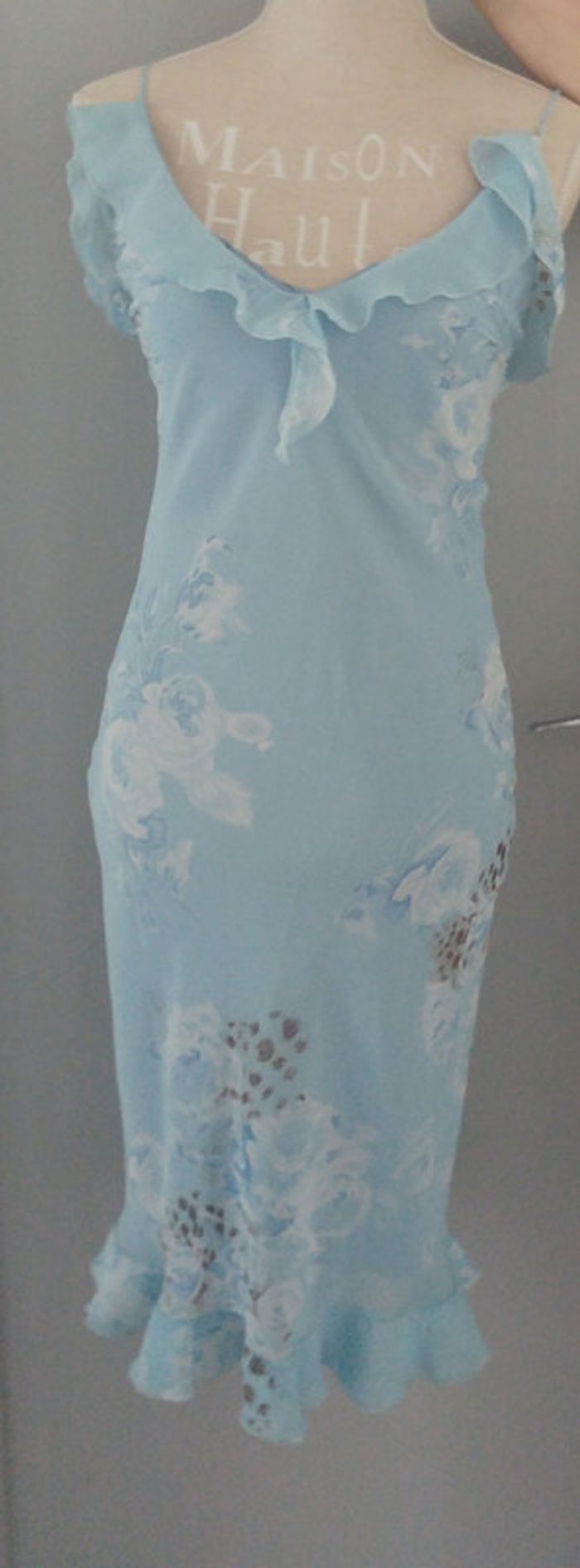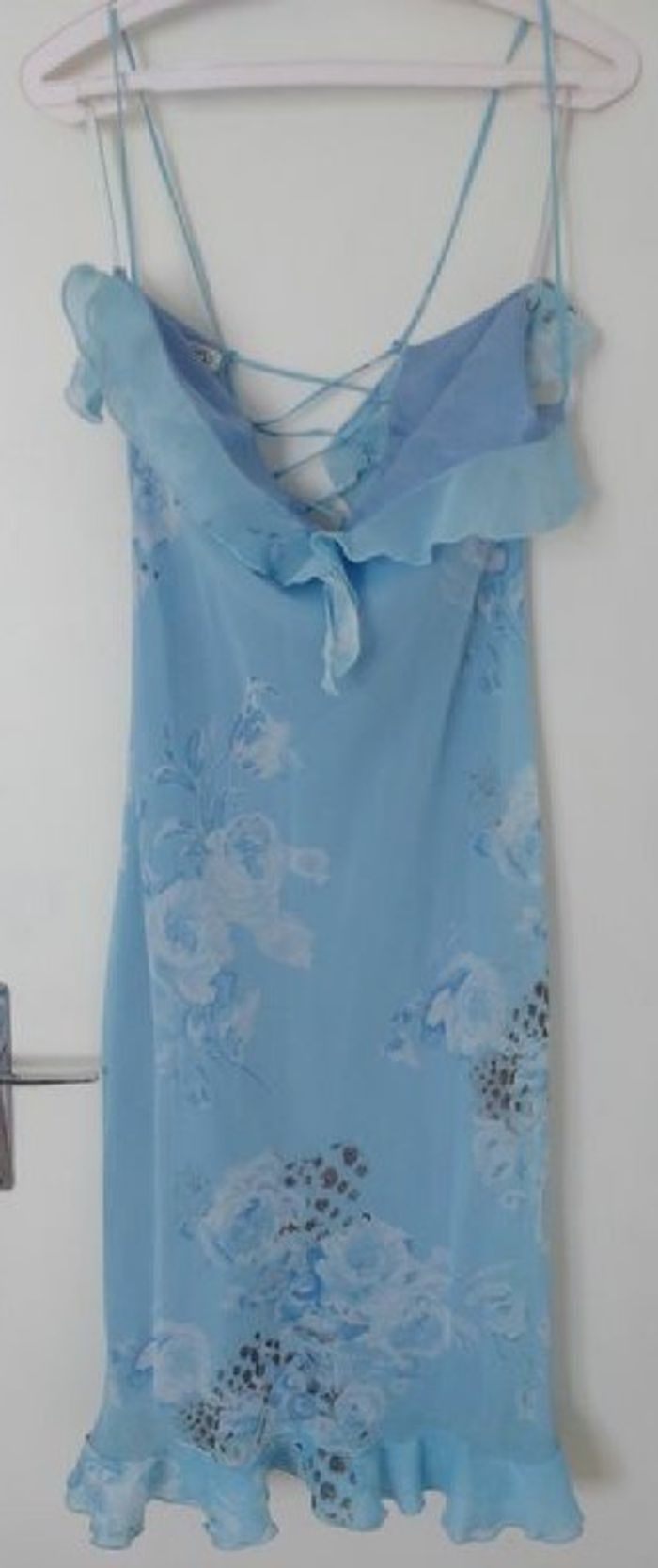 Robe courte pour cocktail. Longueur sans compter les bretelles : environ 99 cm. Les bretelles sont réglables car elles se prolongent par les lacets dans le dos. Tissus doublé. Mise une seule fois.