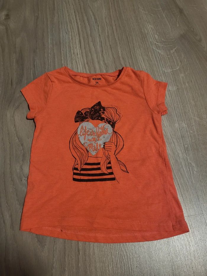 Haut t shirt fille kiabi 2 ans couleur corail mélangée à du rose et orange 😅